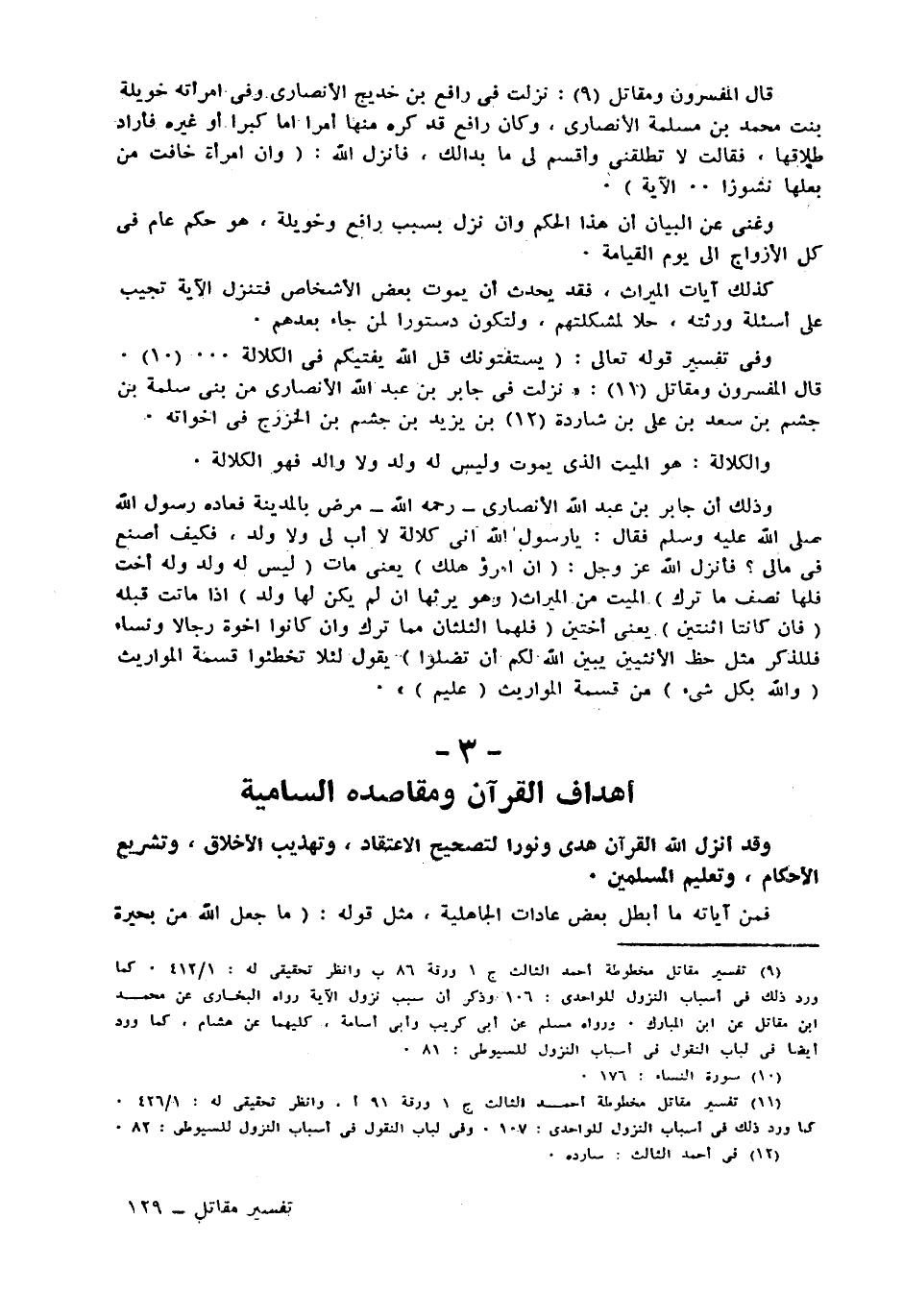 (9) تفسير مقاتل مخطوطة احمد الثالث ج 1 ورقة 86 ب وانظر تحقيقي له: 1/ 412. كما ورد ذلك فى اسباب النزول للواحدي: 106 وذكر ان سبب نزول الآية رواه البخاري عن محمد ابن مقاتل عن ابن المبارك. ورواه مسلم عن ابى كريب وابى اسامة، كليهما عن هشام، كما ورد ايضا فى لباب النقول فى اسباب النزول للسيوطي: 81.