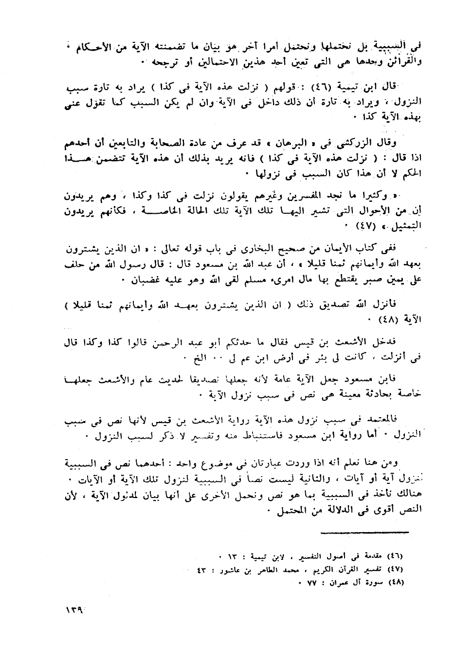 ومن هنا نعلم انه إذا وردت عبارتان فى موضوع واحد: أحدهما نص فى السببية لنزول آية او آيات، والثانية ليست نصا فى السببية لنزول تلك الآية او الآيات.