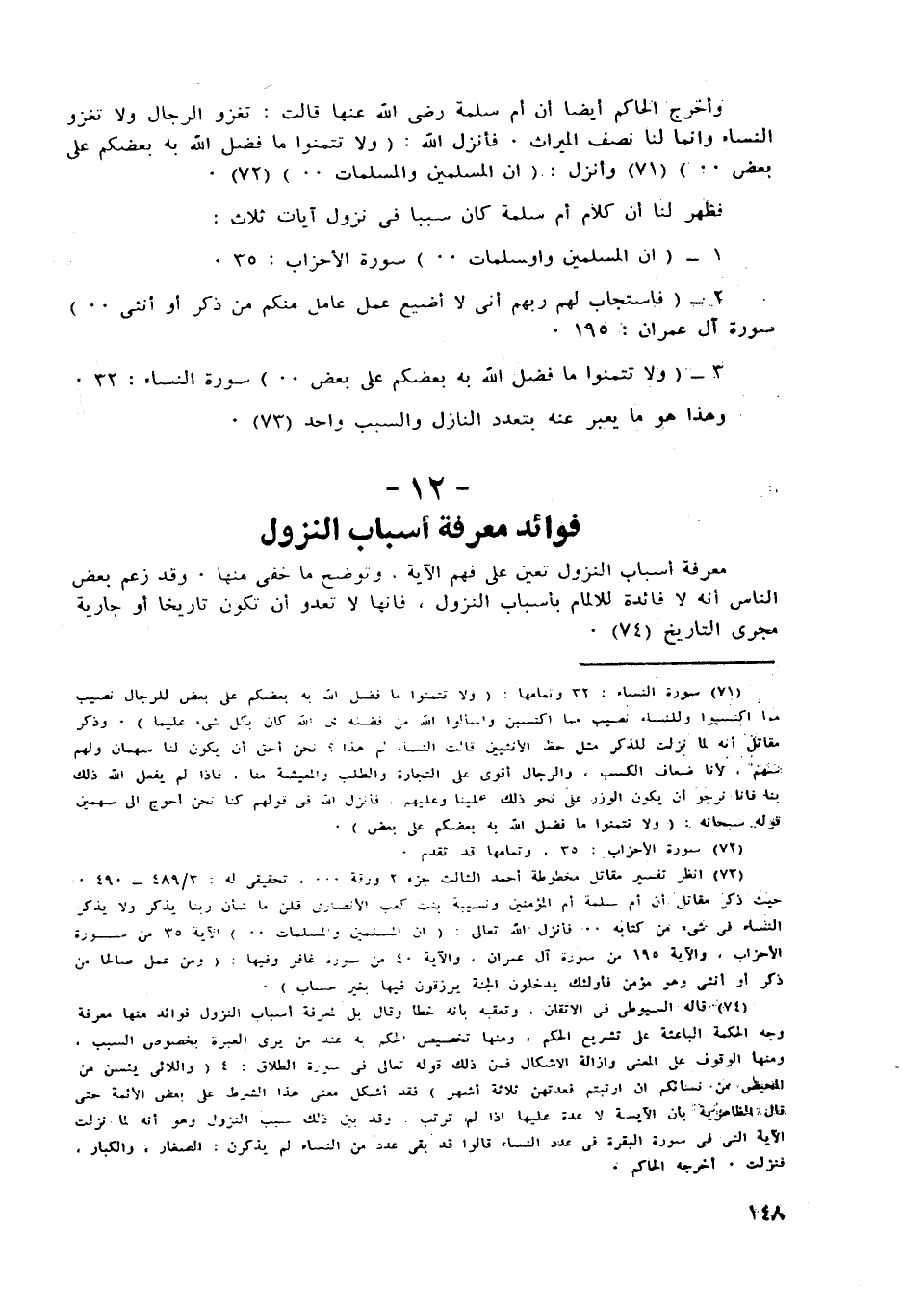 واخرج الحاكم ايضا ان ام سلمة رضى الله عنها قالت: تغزو الرجال ولا تغزو النساء وانما لنا نصف الميراث. فانزل الله: وَلا تَتَمَنَّوْا مَا فَضَّلَ اللَّهُ بِهِ بَعْضَكُمْ عَلى بَعْضٍ ... «71» وانزل: إِنَّ الْمُسْلِمِينَ وَالْمُسْلِماتِ ... «72» .