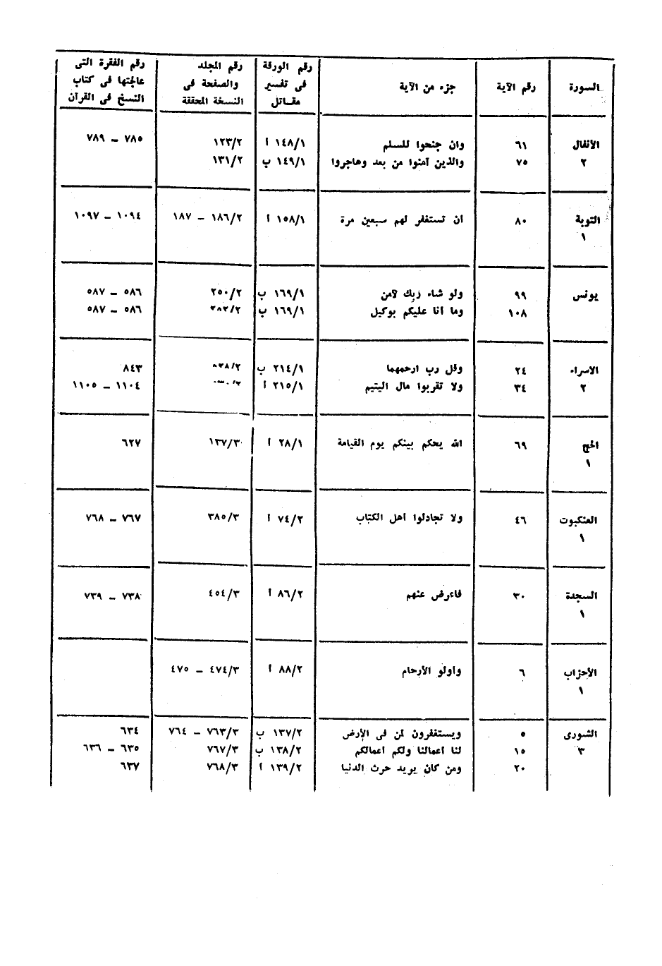 السورة/ رقم الآية/ جزء من الآية/ رقم الورقة فى تفسير مقاتل/ رقم المجلد والصفحة فى النسخة المحققة/ رقم الفقرة التي عالجتها فى كتاب النسخ فى القرآن الأنفال 2/ 61 75/ وَإِنْ جَنَحُوا لِلسَّلْمِ والذين آمنوا من بعد وهاجروا/ 1/ 148 ا 1/ 149 ب/ 2/ 123 2/ 131/ 785- 789 التوبة 1/ 80/ إِنْ تَسْتَغْفِرْ لَهُمْ سَبْعِينَ مَرَّةً/ 1/ 158 ا/ 2/ 186- 187/ 1094- 1097 يونس/ 99 108/ وَلَوْ شاءَ رَبُّكَ لَآمَنَ وما انا عليكم بوكيل/ 1/ 169 ب 1/ 169 ب/ 2/ 250 2/ 252/ 586- 587 586- 587 الاسراء/ 2/ 24 34/ وَقُلْ رَبِّ ارْحَمْهُما ولا تقربوا مال اليتيم/ 1/ 214 ب 1/ 215 ا/ 2/؟ / 2/؟ / 843 1104- 1105 الحج 1/ 69/ اللَّهُ يَحْكُمُ بَيْنَكُمْ يَوْمَ الْقِيامَةِ/ 1/ 28 ا/ 3/ 137/ 627 العنكبوت 1/ 46/ وَلا تُجادِلُوا أَهْلَ الْكِتابِ/ 2/ 74 ا/ 3/ 385/ 767- 768 السجدة 1/ 30/ فَأَعْرِضْ عَنْهُمْ/ 2/ 86 ا/ 3/ 454/ 738- 739 الأحزاب 1/ 6/ وَأُولُوا الْأَرْحامِ/ 2/ 88 ا/ 3/ 474- 475 الشورى 3/ 5 15 20/ وَيَسْتَغْفِرُونَ لِمَنْ فِي الْأَرْضِ لنا اعمالنا ولكم اعمالكم ومن كان يريد حرث الدنيا/ 2/ 137 ب 2/ 138 ب 2/ 139 ا/ 3/ 763- 764 3/ 767 3/ 768/ 634 635- 636 637