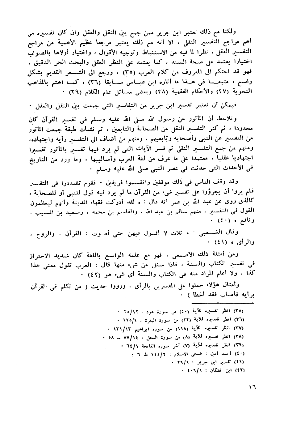 ولكنا مع ذلك نعتبر ابن جرير ممن جمع بين النقل والعقل وان كان تفسيره من أهم مراجع التفسير النقلى، الا أنه مع ذلك يعتبر مرجعا عظيم الأهمية من مراجع التفسير العقلي، نظرا لما فيه من الاستنباط وتوجيه الأقوال، واختيار أولاها بالصواب اختيارا يعتمد على صحة السند، كما يعتمد على النظر العقلي والبحث الحر الدقيق، فهو قد احتكم إلى المعروف من كلام العرب «35» ، ورجع إلى الشعر القديم بشكل واسع، متبعا فى هذا ما أثاره ابن عباس سابقا «36» ، كما اهتم بالمذاهب النحوية «37» والأحكام الفقهية «38» وبعض مسائل علم الكلام «39» .
