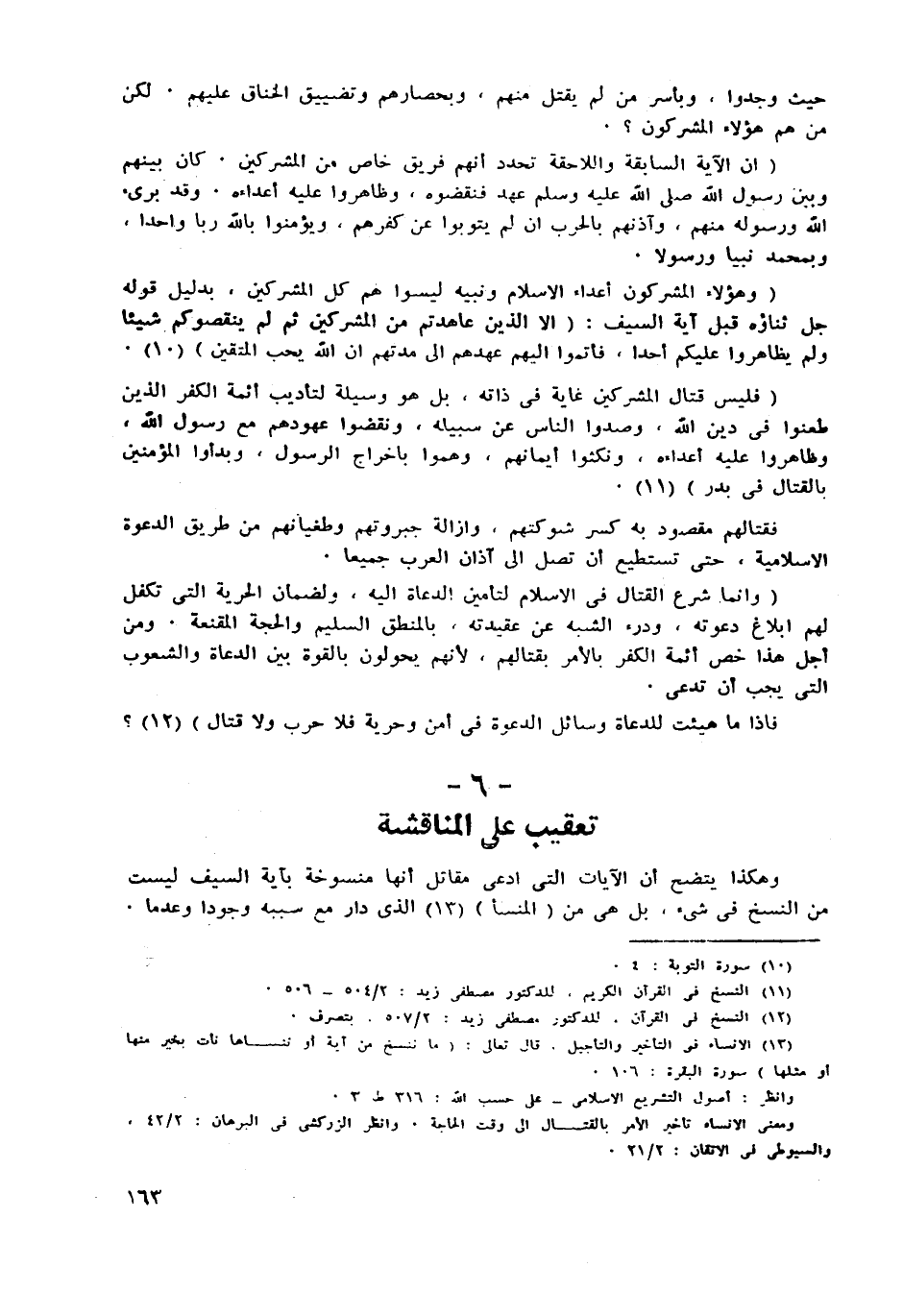 وهكذا يتضح ان الآيات التي ادعى مقاتل انها منسوخة بآية السيف ليست من النسخ فى شيء، بل هي من (المنسأ) «13» الذي دار مع سببه وجودا وعدما.