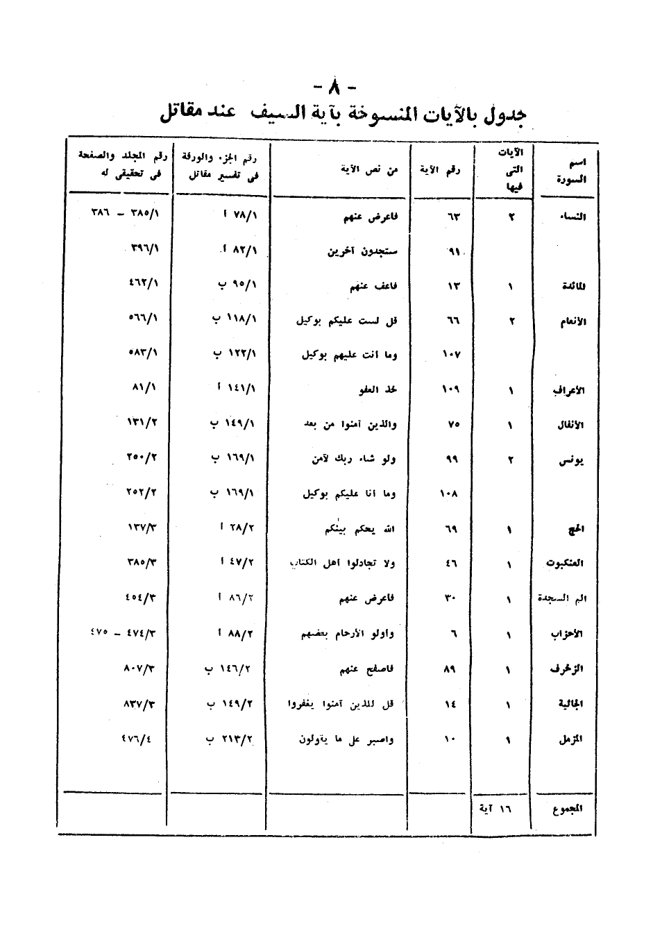 - 8- جدول بالآيات المنسوخة بآية السيف عند مقاتل