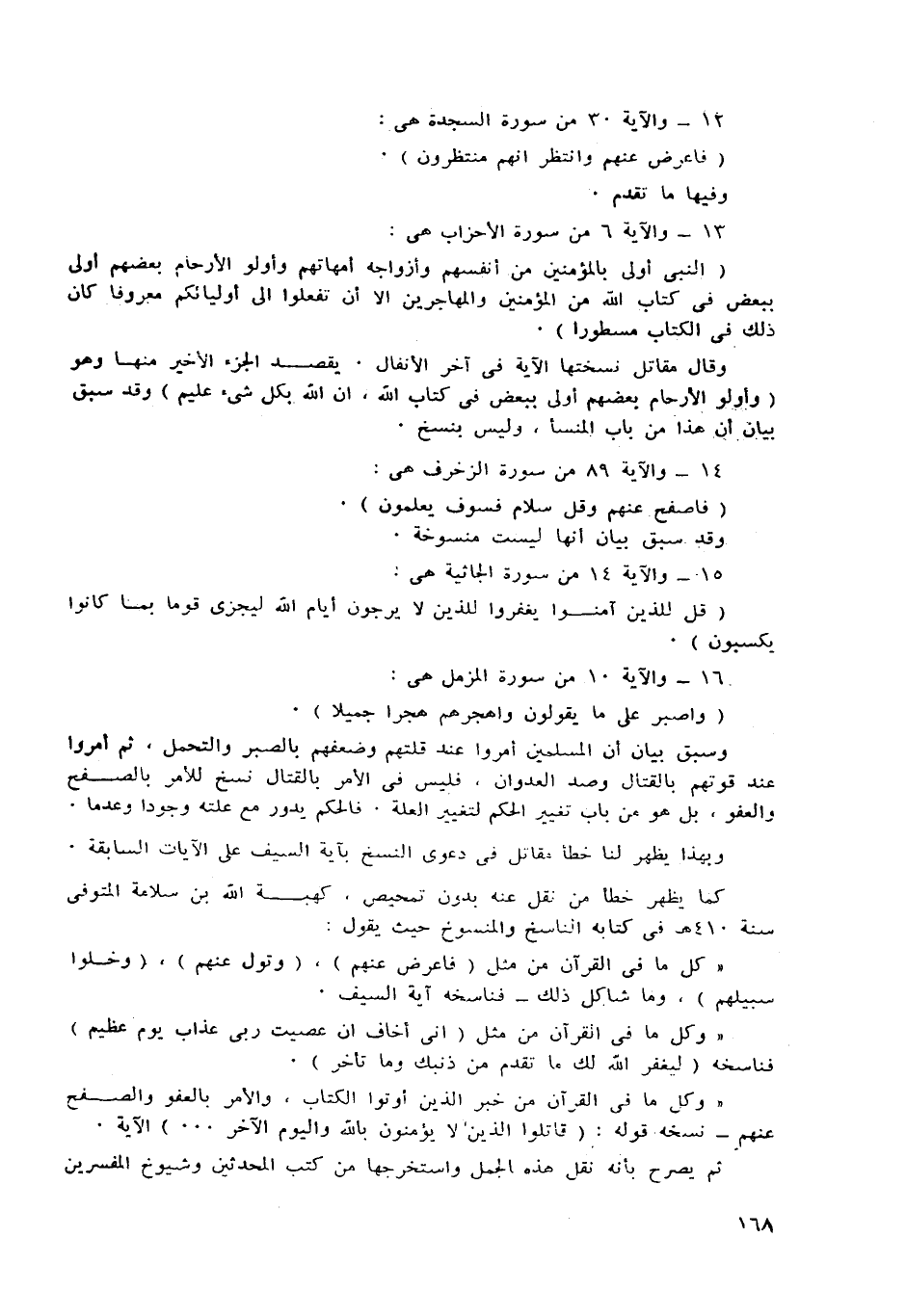 «وكل ما فى القرآن من خبر الذين أوتوا الكتاب، والأمر بالعفو والصفح عنهم- نسخه قوله: قاتِلُوا الَّذِينَ لا يُؤْمِنُونَ بِاللَّهِ وَلا بِالْيَوْمِ الْآخِرِ ... الآية.