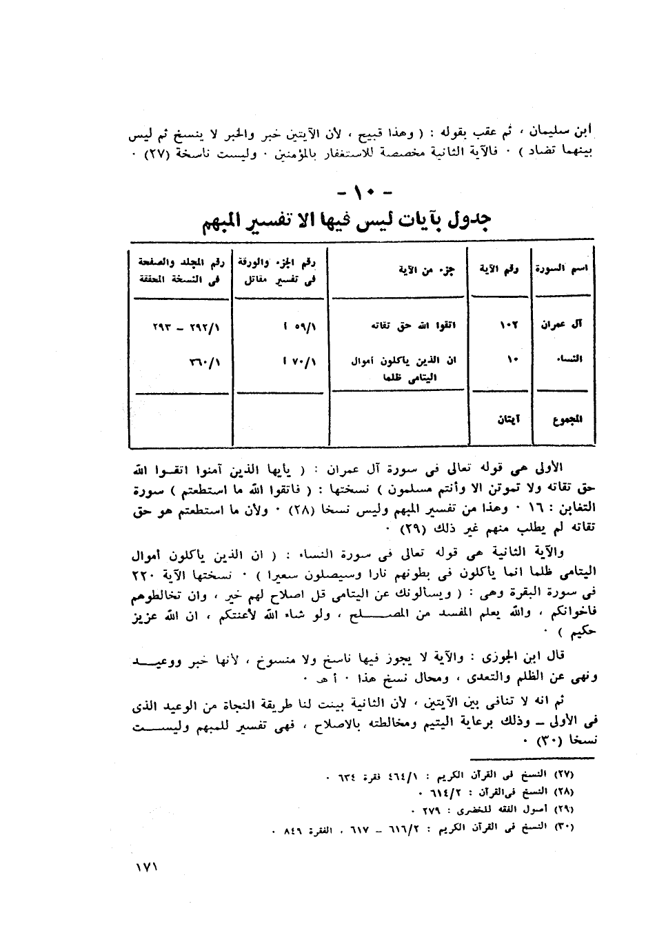 اسم السورة/ رقم الآية/ جزء من الآية/ رقم الجزء والورقة فى تفسير مقاتل/ رقم المجلد والصفحة فى النسخة المحققة آل عمران/ 102/ ااتَّقُوا اللَّهَ حَقَّ تُقاتِهِ/ 1/ 59 ا/ 1/ 292- 293 النساء/ 10/ إِنَّ الَّذِينَ يَأْكُلُونَ أَمْوالَ الْيَتامى ظُلْماً/ 1/ 70 ا/ 1/ 360 المجموع/ آيتان الاولى هي قوله تعالى فى سورة آل عمران: يا أَيُّهَا الَّذِينَ آمَنُوا اتَّقُوا اللَّهَ حَقَّ تُقاتِهِ وَلا تَمُوتُنَّ إِلَّا وَأَنْتُمْ مُسْلِمُونَ نسختها: فَاتَّقُوا اللَّهَ مَا اسْتَطَعْتُمْ سورة التغابن: 16. وهذا من تفسير المبهم وليس نسخا «28» . ولان ما استطعتم هو حق تقاته لم يطلب منهم غير ذلك «29» .