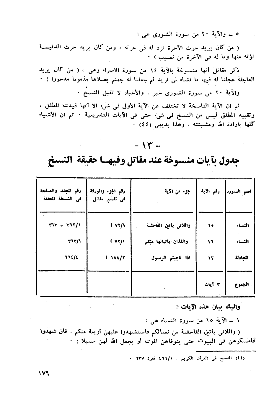 - 13- جدول بآيات منسوخة عند مقاتل وفيها حقيقة النسخ