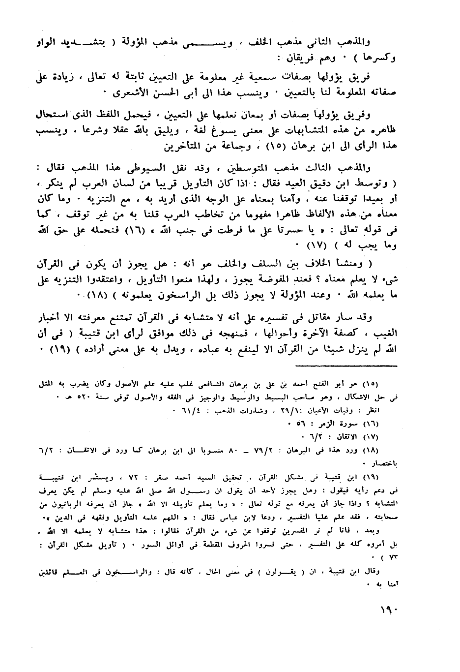 (19) ابن قتيبة فى مشكل القرآن، تحقيق السيد احمد صقر: 72، ويستمر ابن قتيبة فى دعم رأيه فيقول: وهل يجوز لأحد ان يقول أن رسول الله صلى الله عليه وسلم لم يكن يعرف المتشابه؟ وإذا جاز ان يعرفه مع قوله تعالى: وَما يَعْلَمُ تَأْوِيلَهُ إِلَّا اللَّهُ جاز ان يعرفه الربانيون من صحابته،