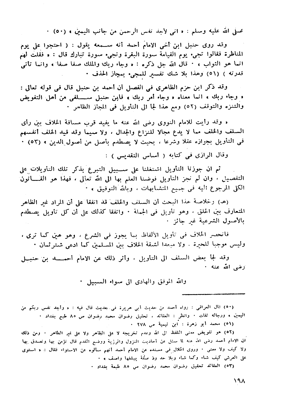 (52) هو تفويض معنى اللفظ الى الله وعدم تخريجه لا على الظاهر ولا على غير الظاهر. ومن ذلك ان الامام احمد رضى الله عنه لما سئل عن أحاديث النزول والرزية ووضع القدم قال نؤمن بها ونصدق بها ولا كيف ولا معنى. وروى الحلال فى مسنده عن الامام احمد انهم سألوه عن الاستواء فقال: «استوى على العرش كيف شاء وكما شاء وبلا حد وذ صفة يبلغها واصف» .
