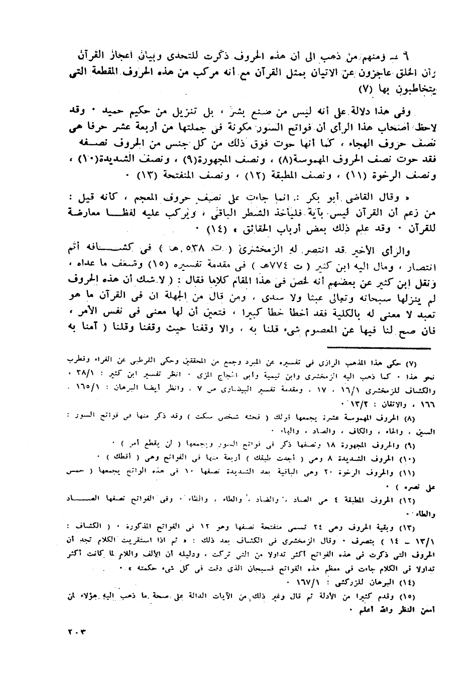 1/ 13- 14) بتصرف. وقال الزمخشري فى الكشاف بعد ذلك: «ثم إذا استقريت الكلام تجد ان الحروف التي ذكرت فى هذه الفواتح اكثر تداولا من التي تركت، ودليله ان الالف واللام لما كانت اكثر تداولا فى الكلام جاءت فى معظم هذه الفواتح فسبحان الذي دقت فى كل شيء حكمته» .