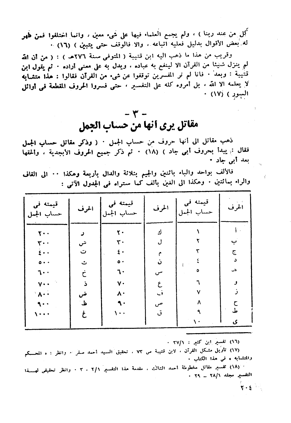 وقريب من هذا ما ذهب اليه ابن قتيبة (المتوفى سنة 276 هـ) : (من ان الله لم ينزل شيئا من القرآن الا لينفع به عباده، ويدل به على معنى اراده. ثم يقول ابن قتيبة: وبعد. فانا لم نر المفسرين توقفوا عن شيء من القرآن فقالوا: هذا متشابه لا يعلمه الا الله، بل أمروه كله على التفسير، حتى فسروا الحروف المقطعة فى أوائل السور) «17» .