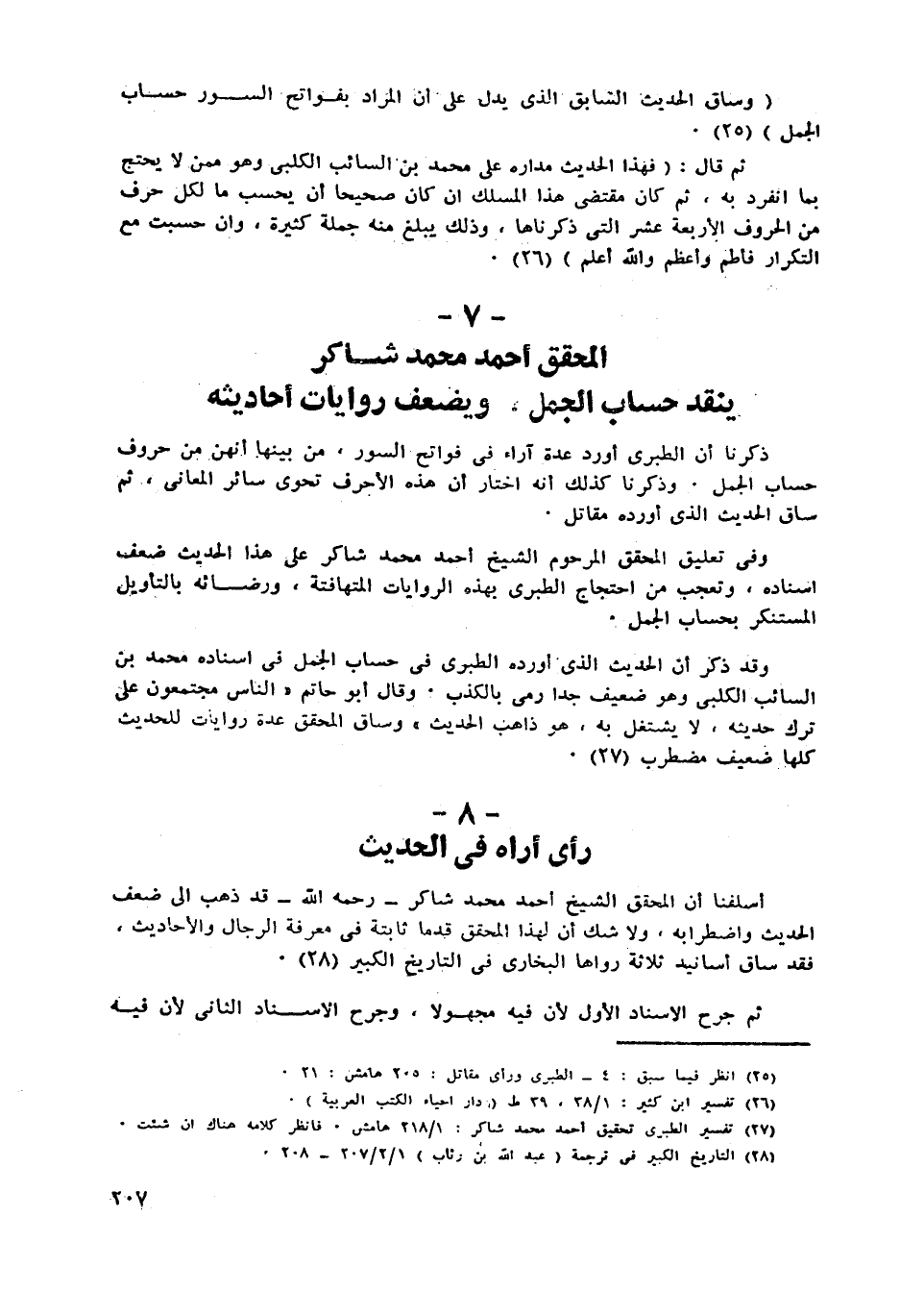 - 7- المحقق احمد محمد شاكر ينقد حساب الجمل، ويضعف روايات أحاديثه