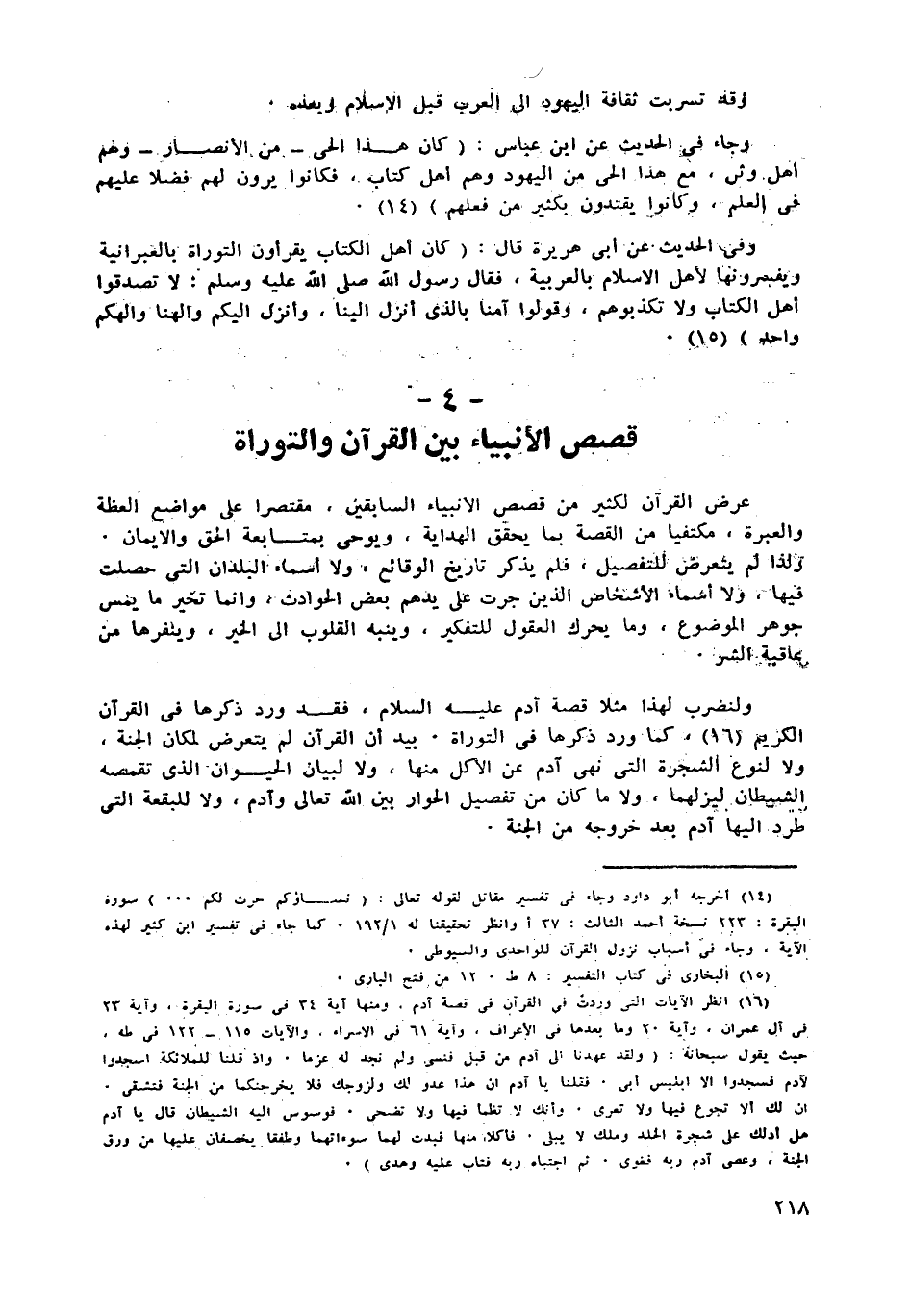 ولنضرب لهذا مثلا قصة آدم عليه السلام، فقد ورد ذكرها فى القرآن الكريم «16» ، كما ورد ذكرها فى التوراة. بيد ان القرآن لم يتعرض لمكان الجنة، ولا لنوع الشجرة التي نهى آدم عن الاكل منها، ولا لبيان الحيوان الذي تقمصه الشيطان ليزلهما، ولا ما كان من تفصيل الحوار بين الله تعالى وآدم، ولا للبقعة التي طرد إليها آدم بعد خروجه من الجنة.