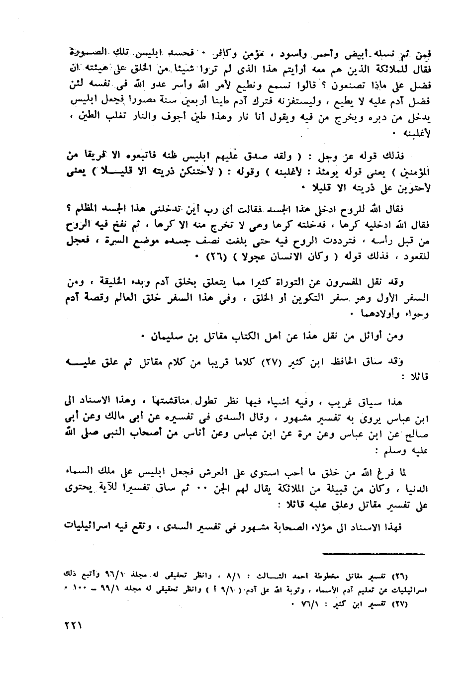 (26) تفسير مقاتل مخطوطة احمد الثالث: 1/ 8، وانظر تحقيقي له مجلد 1/ 96 واتبع ذلك إسرائيليات عن تعليم آدم الأسماء، وتوبة الله على آدم (1/ 9 ا) وانظر تحقيقي له مجلد 1/ 99- 100.