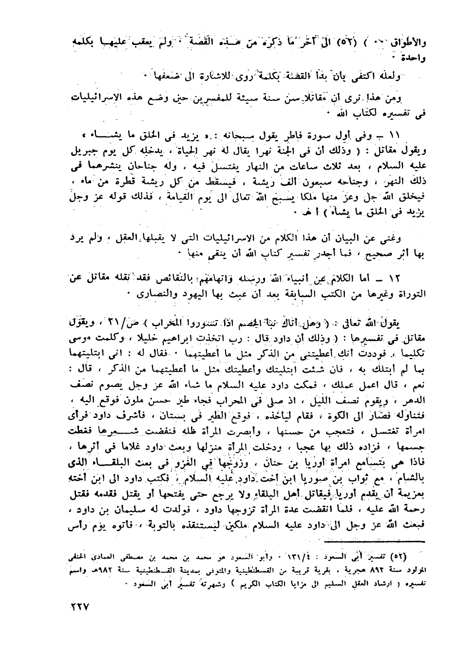 12- اما الكلام عن أنبياء الله ورسله واتهامهم بالنقائص فقد نقله مقاتل عن التوراة وغيرها من الكتب السابقة بعد ان عبث بها اليهود والنصارى.