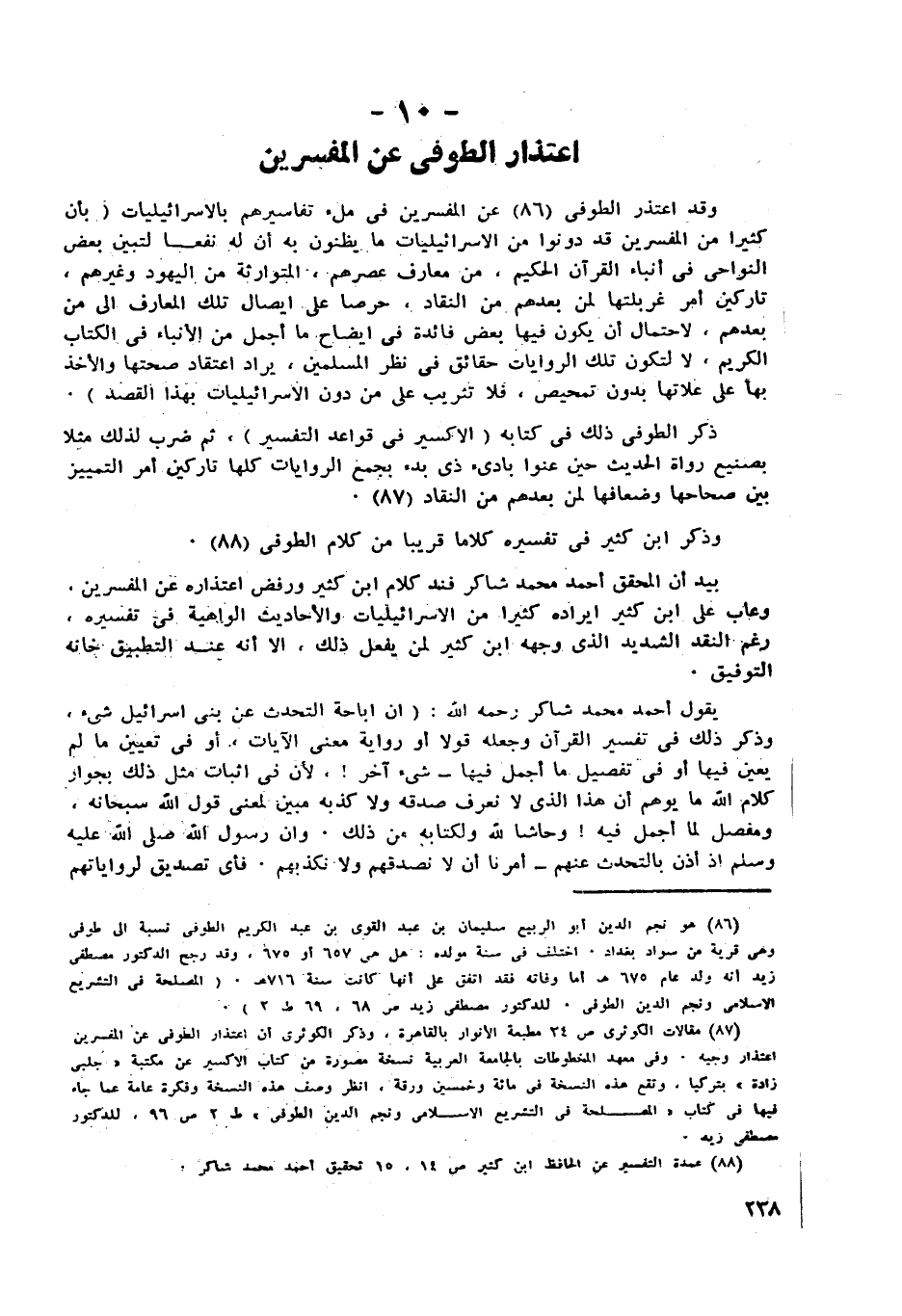 وقد اعتذر الطوفى «86» عن المفسرين فى ملء تفاسيرهم بالاسرائيليات (بان كثيرا من المفسرين قد دونوا من الاسرائيليات ما يظنون به ان له نفعا لتبين بعض النواحي فى انباء القرآن الحكيم، من معارف عصرهم، المتوارثة من اليهود وغيرهم، تاركين امر غربلتها لمن بعدهم من النقاد، حرصا على إيصال تلك المعارف الى من بعدهم، لاحتمال ان يكون فيها بعض فائدة فى إيضاح ما أجمل من الأنباء فى الكتاب الكريم، لا لتكون تلك الروايات حقائق فى نظر المسلمين، يراد اعتقاد صحتها والأخذ بها على علاتها بدون تمحيص، فلا تثريب على من دون الاسرائيليات بهذا القصد) .
