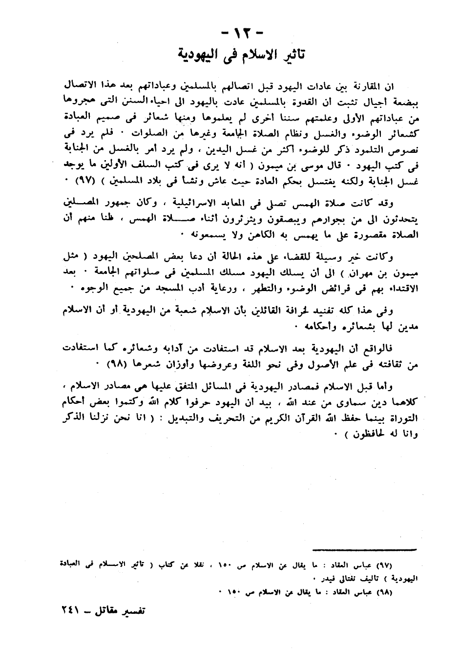 (97) عباس العقاد: ما يقال عن الإسلام ص 150، نقلا عن كتاب (تأثير الإسلام فى العبادة اليهودية) تأليف نفتالى فيدر.