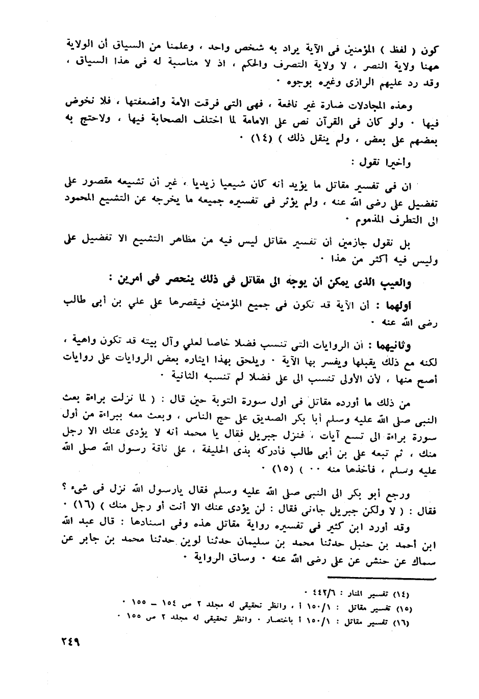 وثانيهما: ان الروايات التي تنسب فضلا خاصا لعلي وآل بيته قد تكون واهية، لكنه مع ذلك يقبلها ويفسر بها الآية. ويلحق بهذا إيثاره بعض الروايات على روايات أصح منها، لان الاولى تنسب الى على فضلا لم تنسبه الثانية.