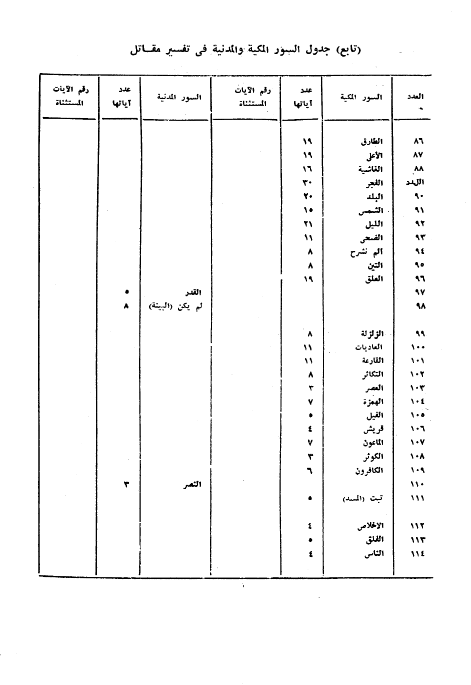 (تابع) جدول السور المكية والمدنية فى تفسير مقاتل العدد/ السور المكية/ عدد آياتها/ رقم الآيات المستثناة/ السور المدنية/ عدد آياتها/ رقم الآيات المستثناة 86/ الطارق/ 19//// 87/ الأعلى/ 19//// 88/ الغاشية/ 16//// العدد/ الفجر/ 30//// 90/ البلد/ 20//// 91/ الشمس/ 15//// 92/ الليل/ 21//// 93/ الضحى/ 11//// 94/ الم نشرح/ 8//// 95/ التين/ 8//// 96/ العلق/ 19//// 97//// القدر/ 5/ 98//// لم يكن (البينة) / 8/ 99/ الزلزلة/ 8/ 100/ العاديات/ 11//// 101/ القارعة/ 11//// 102/ التكاثر/ 8//// 103/ العصر/ 3//// 104/ الهمزة/ 7//// 105/ الفيل/ 5//// 106/ قريش/ 4//// 107/ الماعون/ 7//// 108/ الكوثر/ 3//// 109/ الكافرون/ 6//// 110//// النصر/ 3/ 111/ تبت (المسد) / 5//// 112/ الإخلاص/ 4//// 113/ الفلق/ 5//// 114/ الناس/ 4////