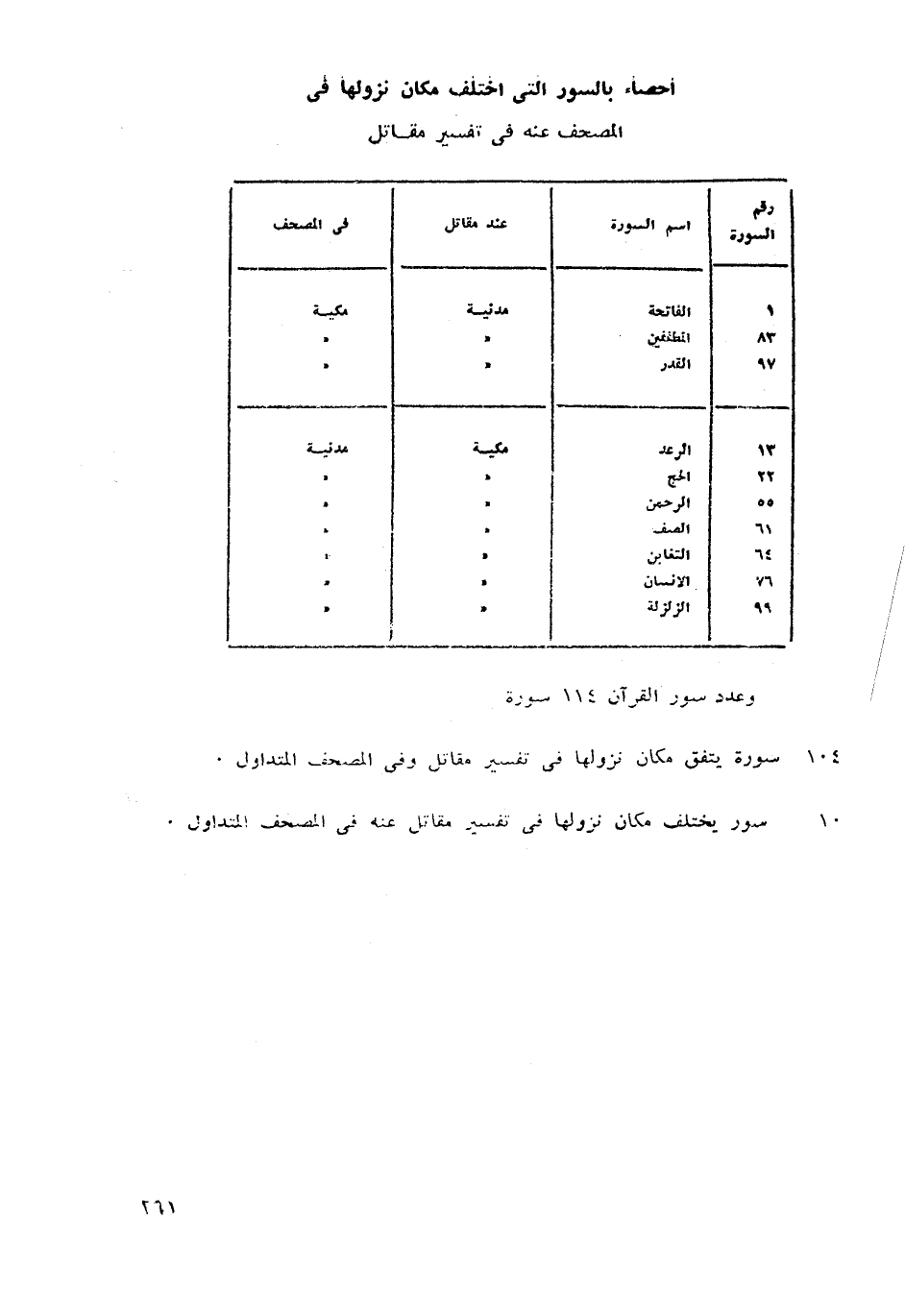 رقم السورة/ اسم السورة/ عند مقاتل/ فى المصحف 1/ الفاتحة/ مدنية/ مكية 83/ المطففين/ مدنية/ مكية 97/ القدر/ مدنية/ مكية 13/ الرعد/ مكية/ مدنية 22/ الحج/ مكية/ مدنية 55/ الرحمن/ مكية/ مدنية 61/ الصف/ مكية/ مدنية 64/ التغابن/ مكية/ مدنية 76/ الإنسان/ مكية/ مدنية 99/ الزلزلة/ مكية/ مدنية وعدد سور القرآن 114 سورة 104 سورة يتفق مكان نزولها فى تفسير مقاتل وفى المصحف المتداول.
