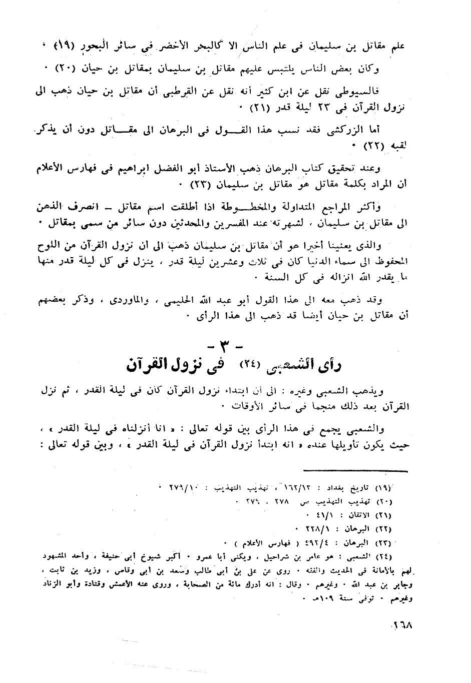فالسيوطي نقل عن ابن كثير انه نقل عن القرطبي ان مقاتل بن حيان ذهب الى نزول القرآن فى 23 ليلة قدر «21» .