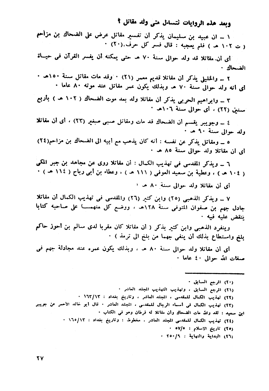 أى أن مقاتلا قد ولد حوالى سنة 70 هـ حتى يمكنه أن يفسر القرآن فى حياة الضحاك.