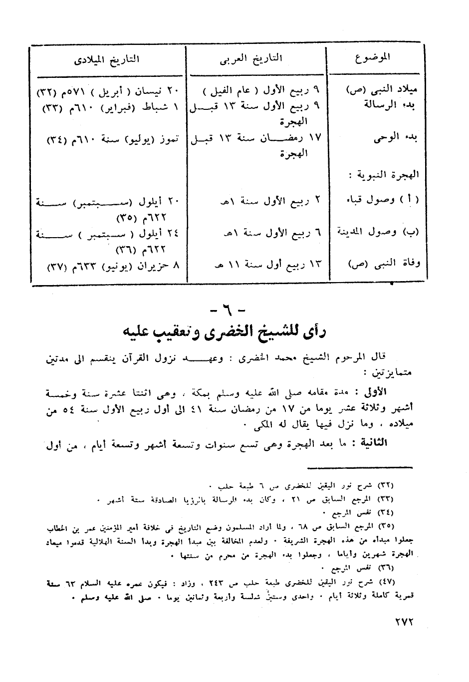 (ا) وصول قباء/ 2 ربيع الاول سنة 1 هـ/ 20 أيلول (سبتمبر) سنة 622 م «35» (ب) وصول المدينة/ 6 ربيع الاول سنة 1 هـ/ 24 أيلول (سبتمبر) سنة 622 م «36» وفاة النبي (ص) / 13 ربيع أول سنة 11 هـ/ 8 حزيران (يونيو) 633 م «37»