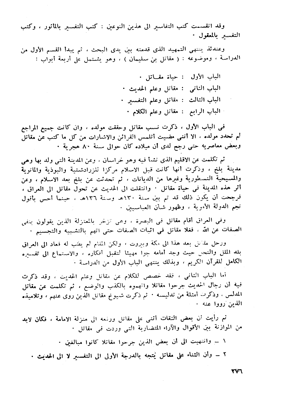 وعندئذ ينتهى التمهيد الذي قدمته بين يدي البحث، ثم يبدأ القسم الاول من الدراسة، وموضوعه: (مقاتل بن سليمان) ، وهو يشتمل على اربعة أبواب: