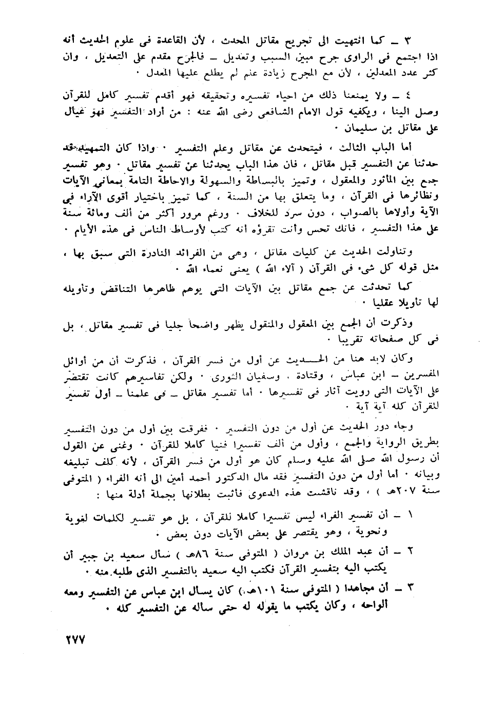 وكان لا بد هنا من الحديث عن أول من فسر القرآن، فذكرت ان من أوائل المفسرين- ابن عباس، وقتادة، وسفيان الثوري. ولكن تفاسيرهم كانت تقتصر على الآيات التي رويت آثار فى تفسيرها. اما تفسير مقاتل- فى علمنا- أول تفسير للقرآن كله آية آية.