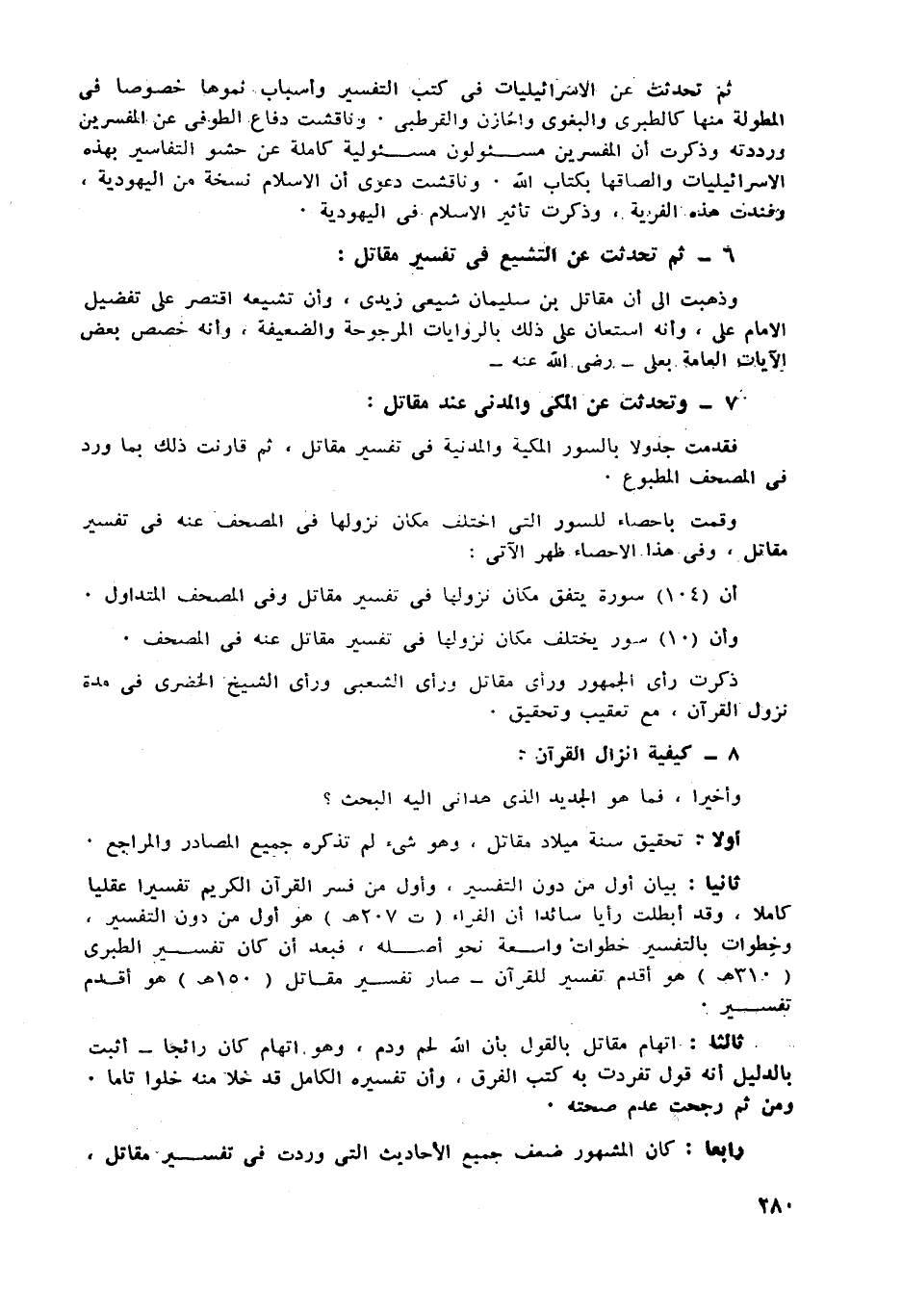 ثانيا: بيان أول من دون التفسير، وأول من فسر القرآن الكريم تفسيرا عقليا كاملا، وقد أبطلت رأيا سائدا ان الفراء (ت 207 هـ) هو أول من دون التفسير، وخطوات بالتفسير خطوات واسعة نحو أصله، فبعد ان كان تفسير الطبري (310 هـ) هو اقدم تفسير للقرآن- صار تفسير مقاتل (150 هـ) هو اقدم تفسير.