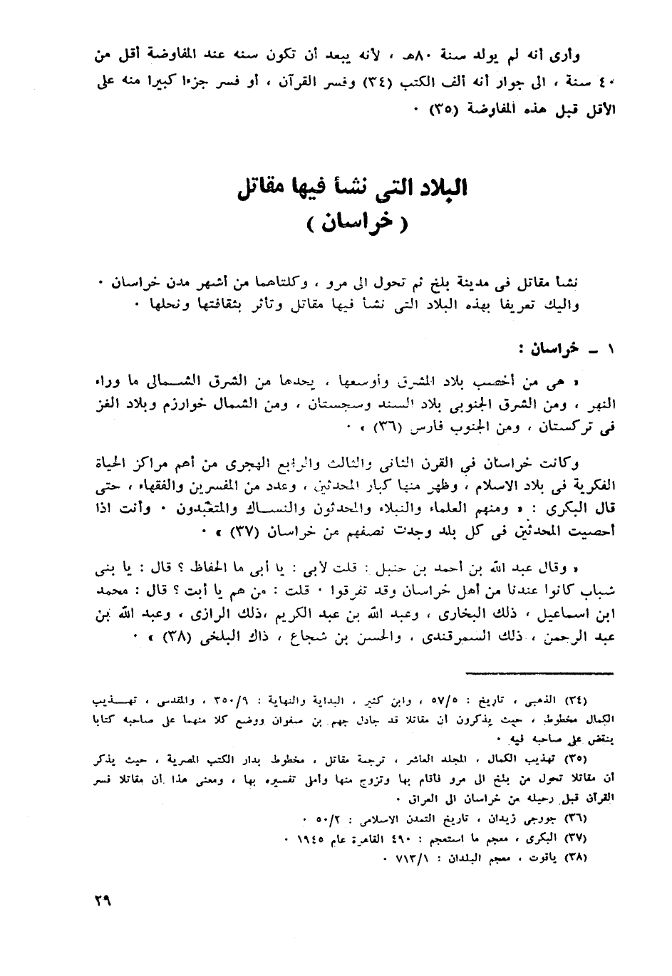 (35) تهذيب الكمال، المجلد العاشر، ترجمة مقاتل، مخطوط بدار الكتب المصرية، حيث يذكر أن مقاتلا تحول من بلخ إلى مرو فأقام بها وتزويج منها وأملى تفسيره بها، ومعنى هذا أنّ مقاتلا فسر القرآن قبل رحيله من خراسان إلى العراق.
