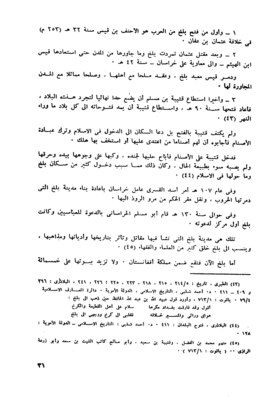 (43) الطبري، تاريخ: 5/ 214، 215، 218، 223، 225، 226، 241، البلاذري: 396 و 409- 411. د. أحمد شلبى، التاريخ الإسلامي، الدولة الأموية. دائرة المعارف الاسلامية 4/ 79. ياقوت: 1/ 713، وأورد قول عبيد الله بن عبد الله الحافظ حين ذهب إلى بلخ: