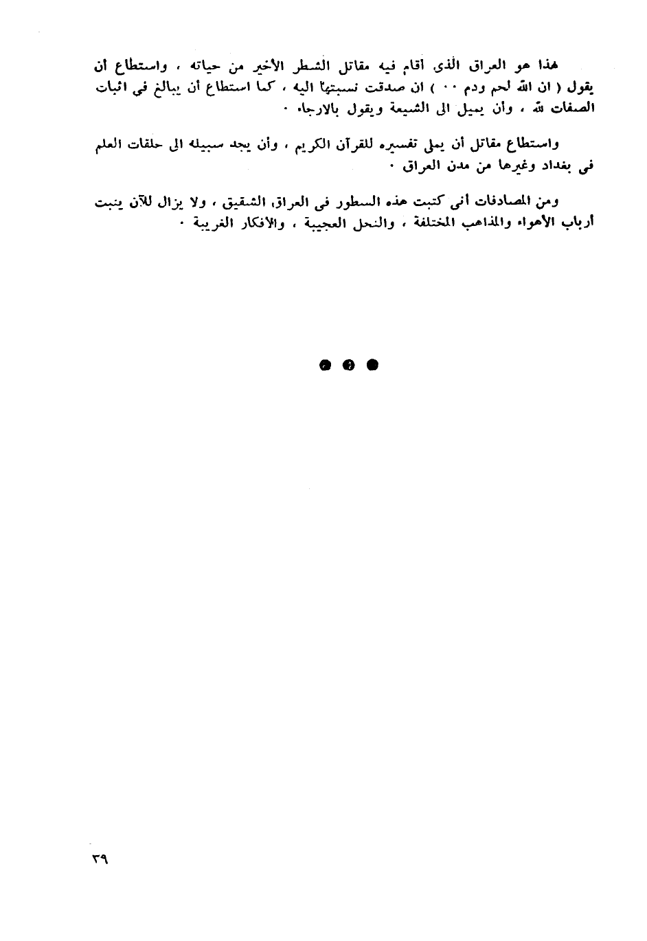 ومن المصادفات انى كتبت هذه السطور فى العراق الشقيق، ولا يزال للآن ينبت ارباب الأهواء والمذاهب المختلفة، والنحل العجيبة، والأفكار الغريبة.