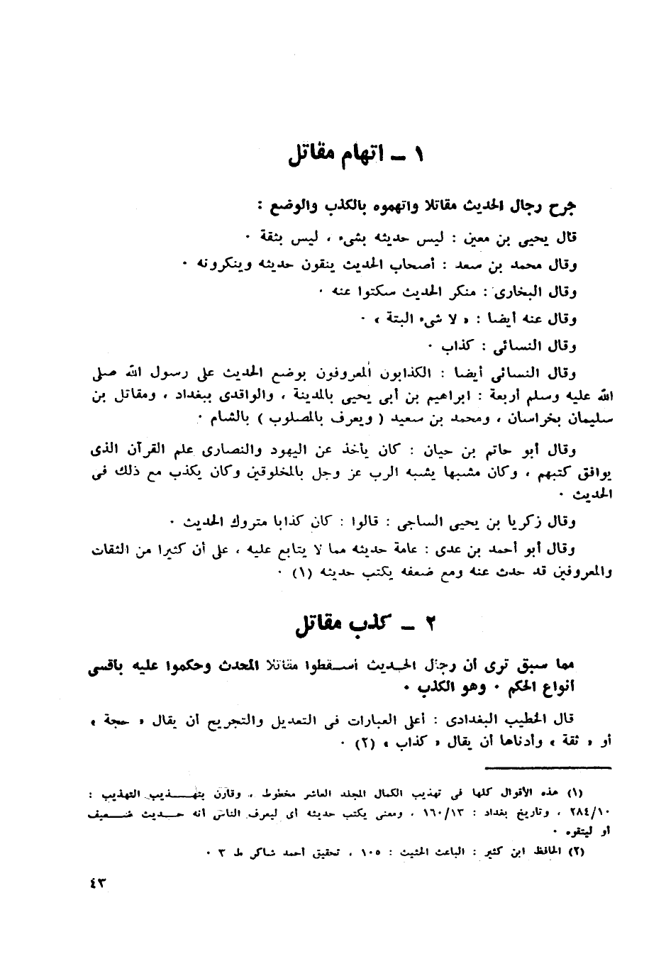 1- اتهام مقاتل جرح رجال الحديث مقاتلا واتهموه بالكذب والوضع: