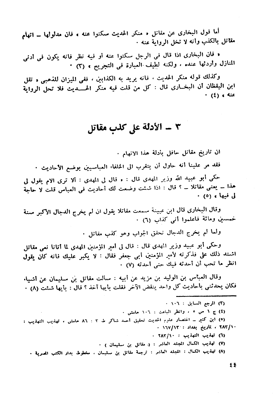 اما قول البخاري عن مقاتل «منكر الحديث سكتوا عنه» فان مدلولها- اتهام مقاتل بالكذب وانه لا تخل الرواية عنه.