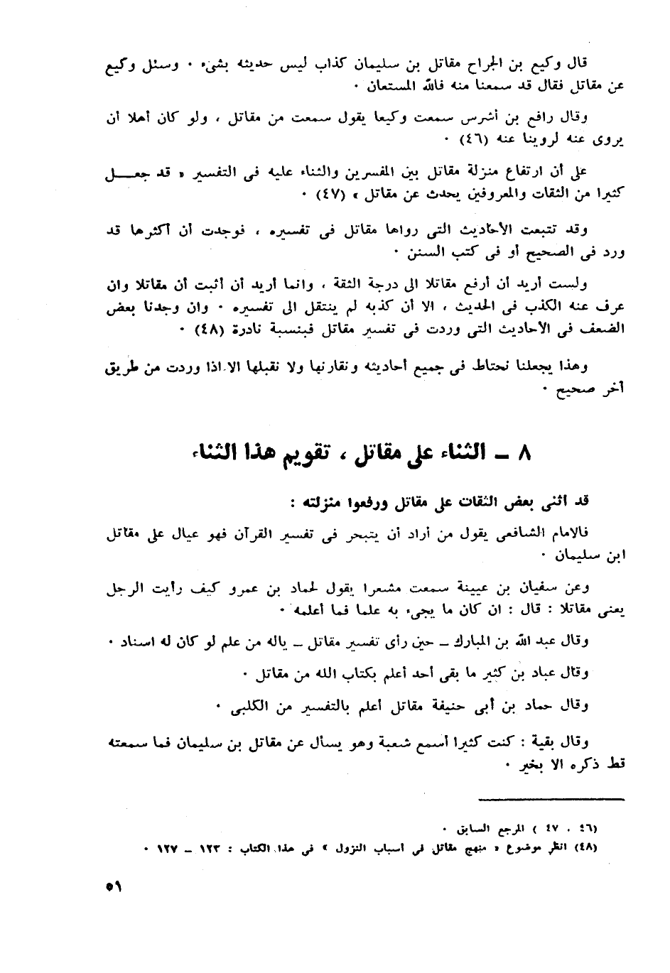 ولست أريد ان ارفع مقاتلا الى درجة الثقة، وانما أريد ان اثبت ان مقاتلا وان عرف عنه الكذب فى الحديث، الا ان كذبه لم ينتقل الى تفسيره. وان وجدنا بعض الضعف فى الأحاديث التي وردت فى تفسير مقاتل فبنسبة نادرة «48» .