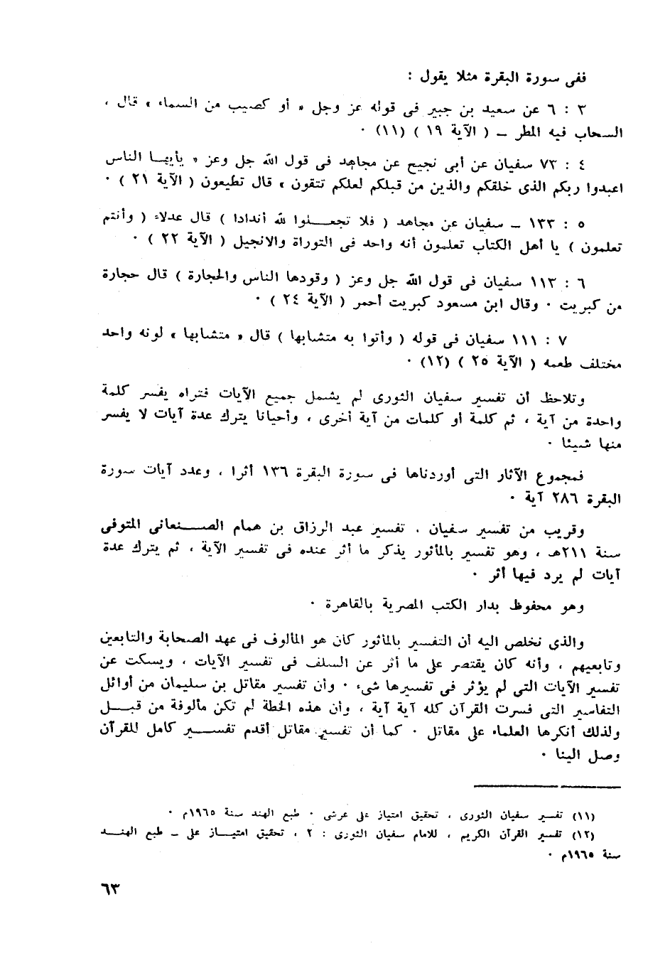 (12) تفسير القرآن الكريم، للإمام سفيان الثوري: 2، تحقيق امتياز على- طبع الهند سنة 1965 م.