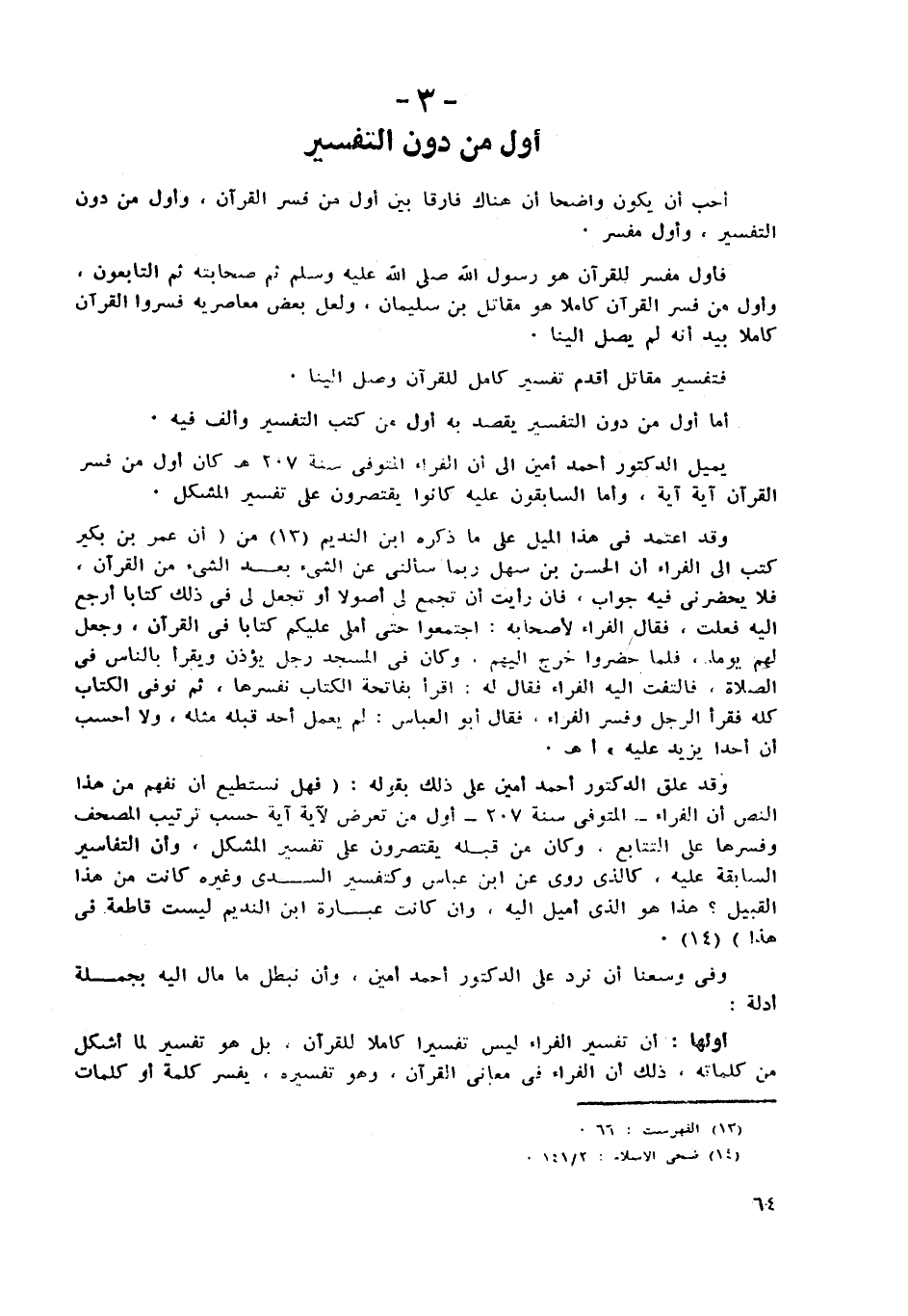 وقد علق الدكتور احمد أمين على ذلك بقوله: (فهل نستطيع ان نفهم من هذا النص ان الفراء- المتوفى سنة 207- أول من تعرض لآية آية حسب ترتيب المصحف وفسرها على التتابع. وكان من قبله يقتصرون على تفسير المشكل، وان التفاسير السابقة عليه، كالذي روى عن ابن عباس وكتفسير السدى وغيره كانت من هذا القبيل؟ هذا هو الذي أميل اليه، وان كانت عبارة ابن النديم ليست قاطعة فى هذا) «14» .