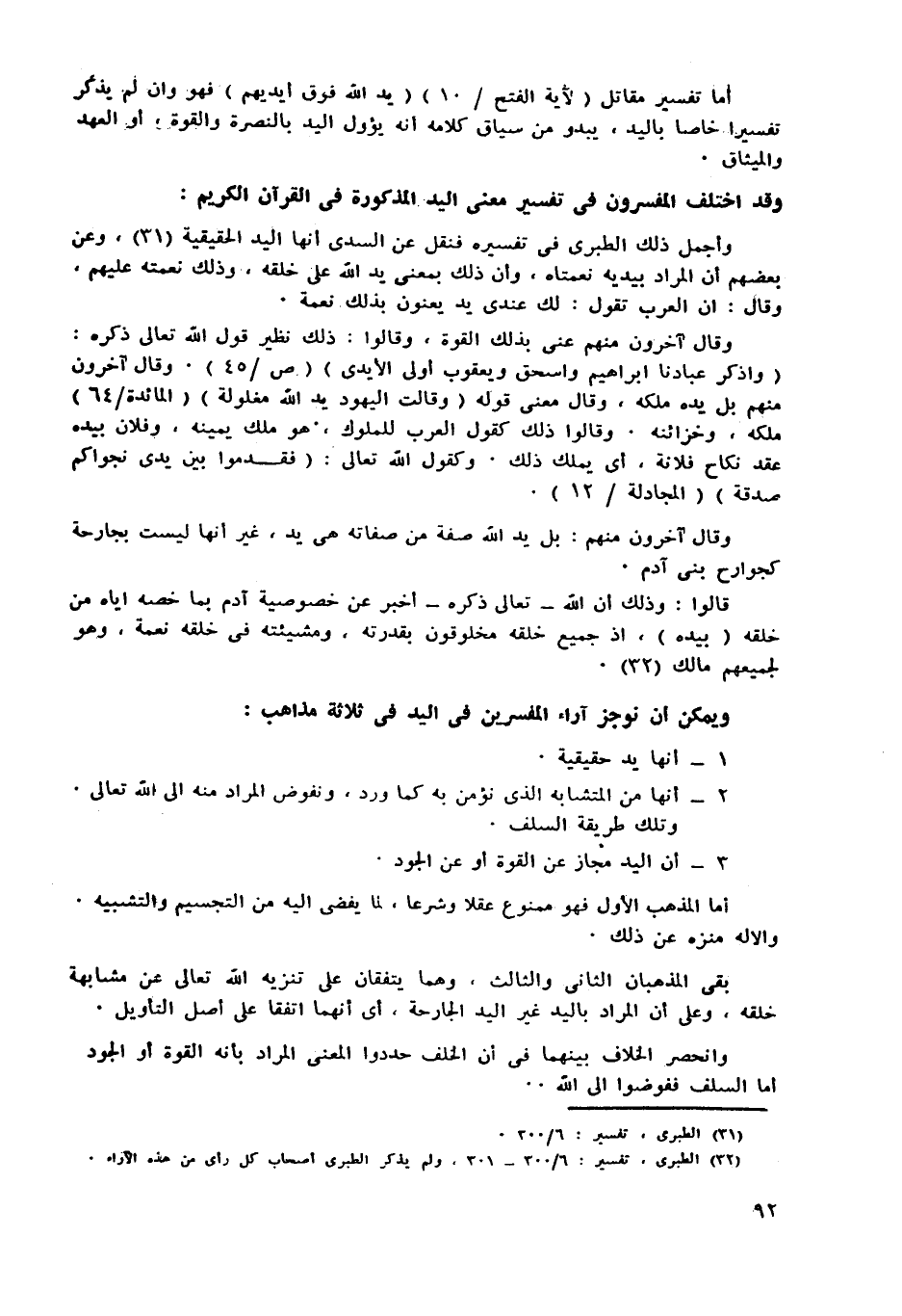 وأجمل ذلك الطبري فى تفسيره فنقل عن السدى انها اليد الحقيقة «31» ، وعن بعضهم ان المراد بيديه نعمتاه، وان ذلك بمعنى يد الله على خلقه، وذلك نعمته عليهم، وقال: ان العرب تقول: لك عندي يد يعنون بذلك نعمة.