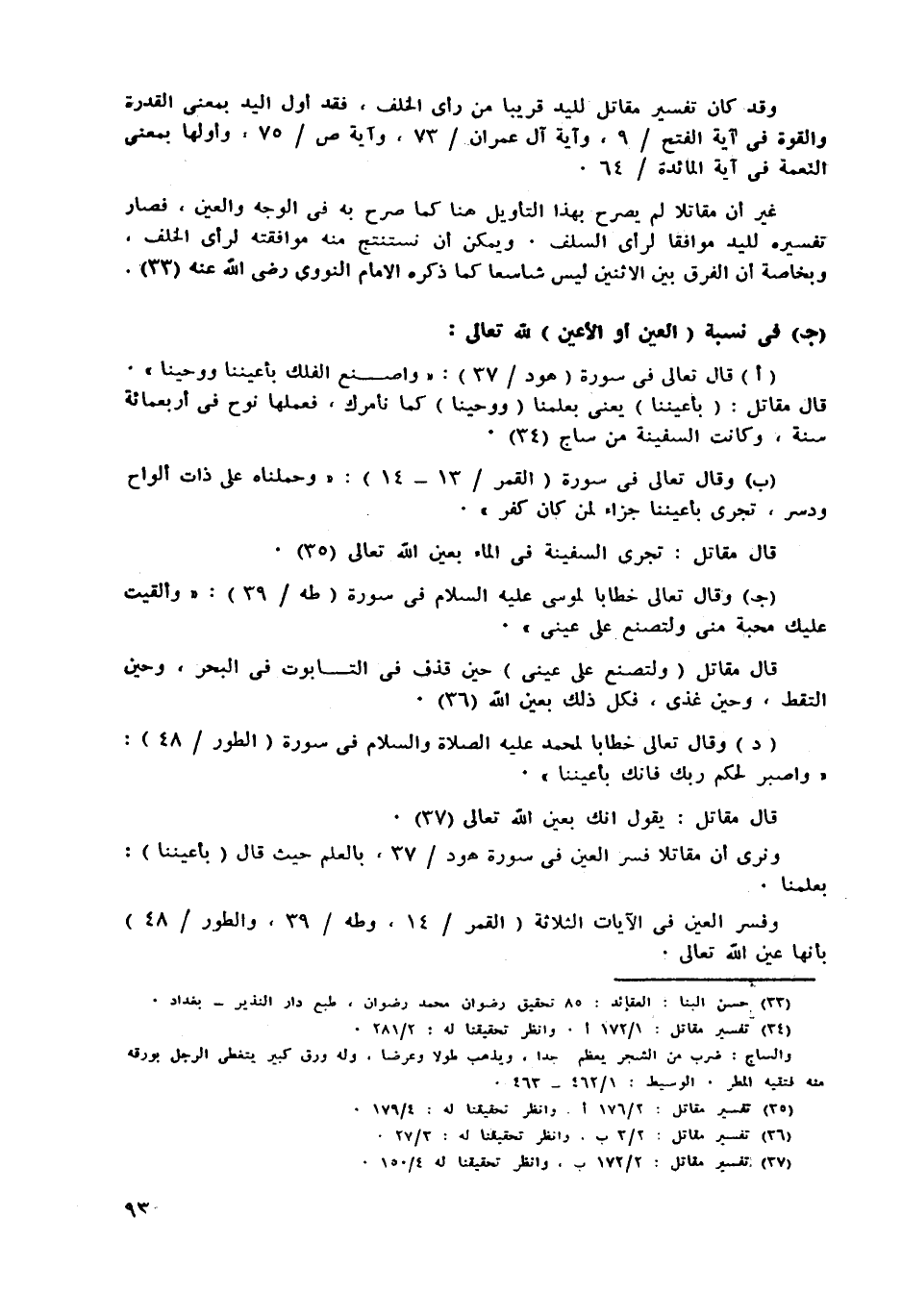 ونرى ان مقاتلا فسر العين فى سورة هود/ 37، بالعلم حيث قال (بأعيننا) :