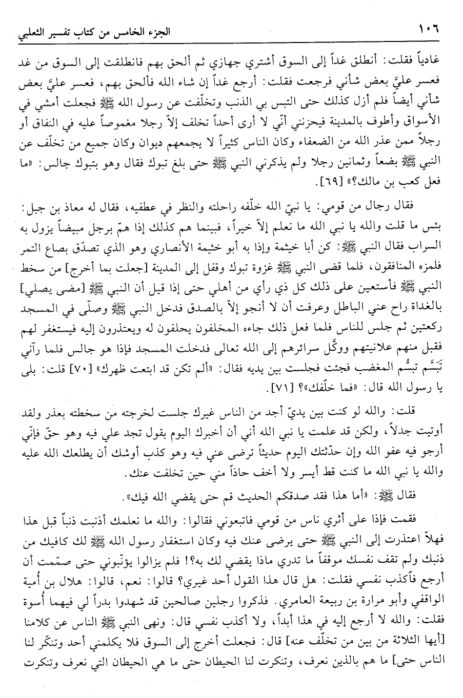 غاديا فقلت: أنطلق غدا إلى السوق أشتري جهازي ثم ألحق بهم فانطلقت إلى السوق من غد فعسر عليّ بعض شأني فرجعت فقلت: أرجع غدا إن شاء الله فألحق بهم، فعسر عليّ بعض شأني أيضا فلم أزل كذلك حتى التبس بي الذنب وتخلّفت عن رسول اله صلى الله سلّم فجعلت أمشي في الأسواق وأطوف بالمدينة فيحزنني أنّي لا أرى أحدا تخلف إلّا رجلا مغموصا عليه في النفاق أو رجلا ممن عذر الله من الضعفاء وكان الناس كثيرا لا يجمعهم ديوان وكان جميع من تخلّف عن النبي صلى الله عليه وسلّم بضعا وثمانين رجلا ولم يذكرني النبي صلى الله عليه وسلّم حتى بلغ تبوك فقال وهو بتبوك جالس: «ما فعل كعب بن مالك؟» [69] .