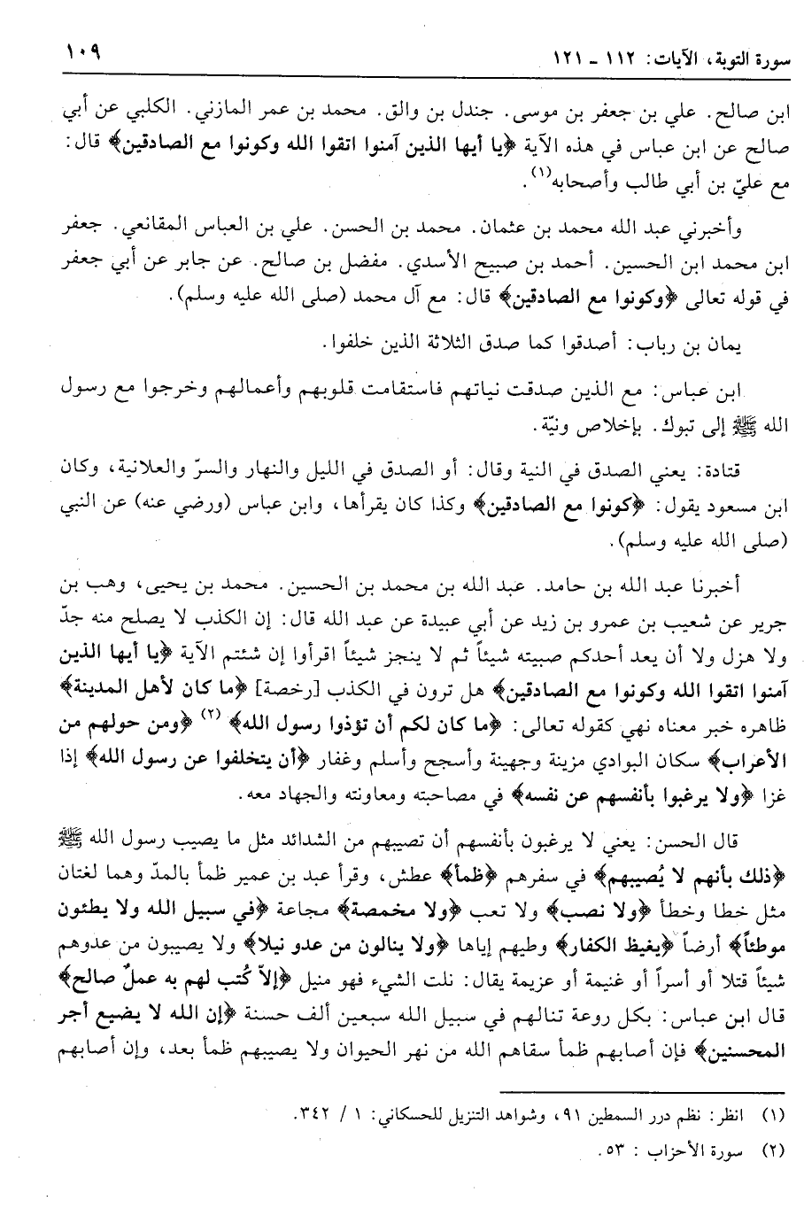 وأخبرني عبد الله محمد بن عثمان. محمد بن الحسن. علي بن العباس المقانعي. جعفر ابن محمد ابن الحسين. أحمد بن صبيح الأسدي. مفضل بن صالح. عن جابر عن أبي جعفر في قوله تعالى وَكُونُوا مَعَ الصَّادِقِينَ قال: مع آل محمد (صلى الله عليه وسلّم) .