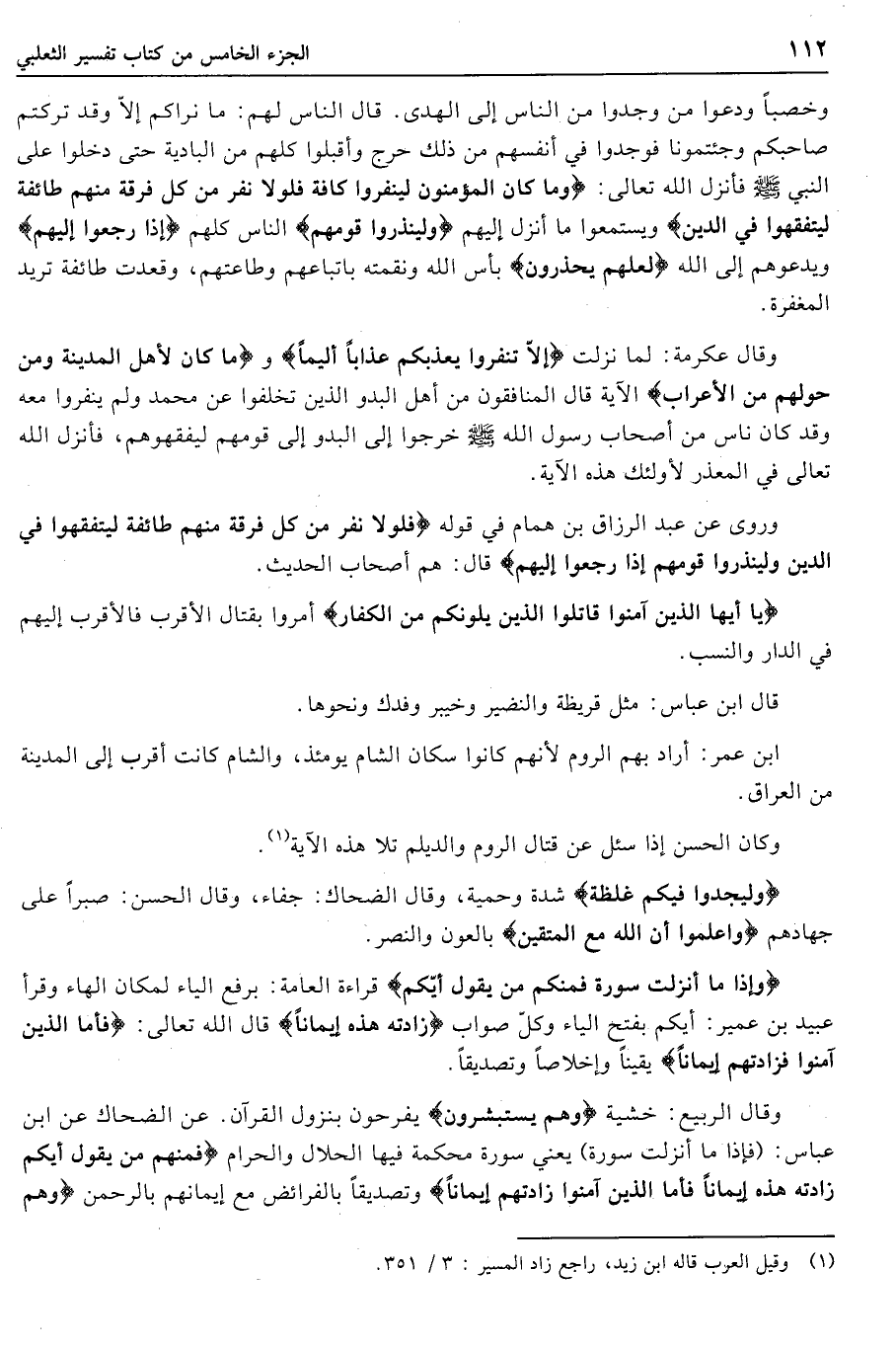وروى عن عبد الرزاق بن همام في قوله فَلَوْلا نَفَرَ مِنْ كُلِّ فِرْقَةٍ مِنْهُمْ طائِفَةٌ لِيَتَفَقَّهُوا فِي الدِّينِ وَلِيُنْذِرُوا قَوْمَهُمْ إِذا رَجَعُوا إِلَيْهِمْ قال: هم أصحاب الحديث.