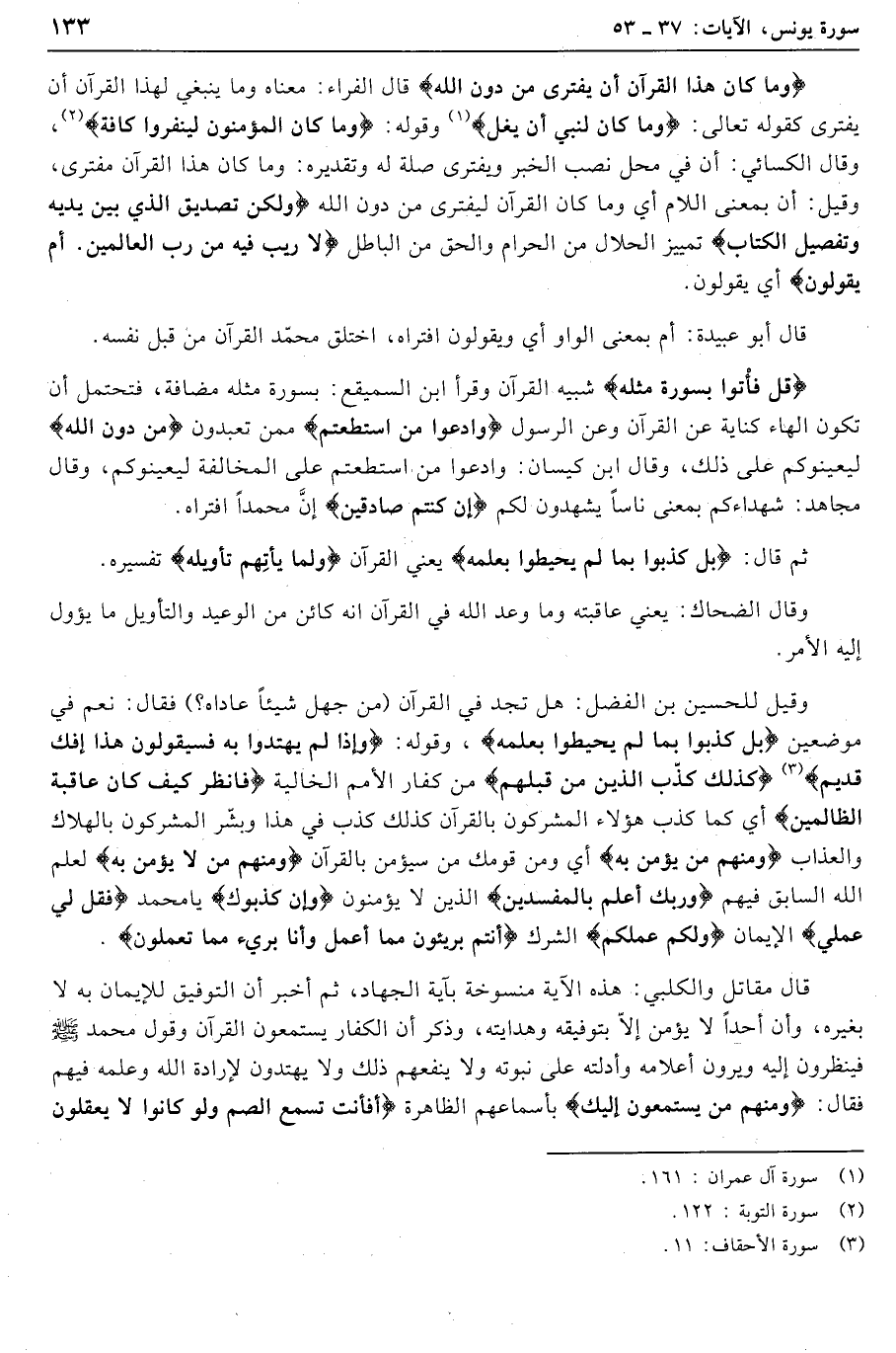 وَما كانَ هذَا الْقُرْآنُ أَنْ يُفْتَرى مِنْ دُونِ اللَّهِ قال الفراء: معناه وما ينبغي لهذا القرآن أن يفترى كقوله تعالى: وَما كانَ لِنَبِيٍّ أَنْ يَغُلَّ «1» وقوله: وَما كانَ الْمُؤْمِنُونَ لِيَنْفِرُوا كَافَّةً «2» ، وقال الكسائي: أن في محل نصب الخبر ويفترى صلة له وتقديره: وما كان هذا القرآن مفترى، وقيل: أن بمعنى اللام أي وما كان القرآن ليفترى من دون الله وَلكِنْ تَصْدِيقَ الَّذِي بَيْنَ يَدَيْهِ وَتَفْصِيلَ الْكِتابِ تمييز الحلال من الحرام والحق من الباطل لا رَيْبَ فِيهِ مِنْ رَبِّ الْعالَمِينَ. أَمْ يَقُولُونَ أي يقولون.