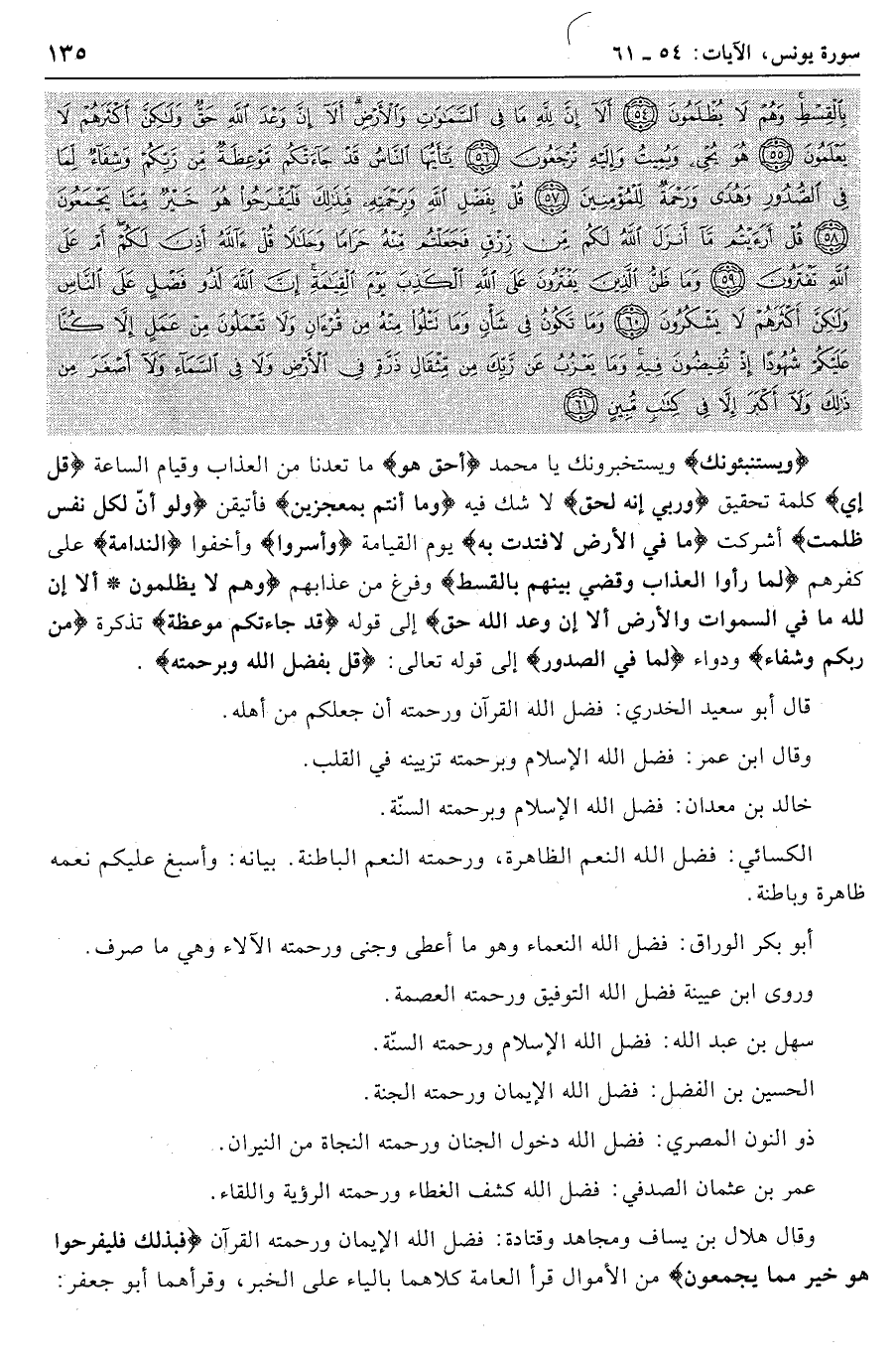 قُلْ بِفَضْلِ اللَّهِ وَبِرَحْمَتِهِ فَبِذلِكَ فَلْيَفْرَحُوا هُوَ خَيْرٌ مِمَّا يَجْمَعُونَ (58) قُلْ أَرَأَيْتُمْ ما أَنْزَلَ اللَّهُ لَكُمْ مِنْ رِزْقٍ فَجَعَلْتُمْ مِنْهُ حَراماً وَحَلالاً قُلْ آللَّهُ أَذِنَ لَكُمْ أَمْ عَلَى اللَّهِ تَفْتَرُونَ (59) وَما ظَنُّ الَّذِينَ يَفْتَرُونَ عَلَى اللَّهِ الْكَذِبَ يَوْمَ الْقِيامَةِ إِنَّ اللَّهَ لَذُو فَضْلٍ عَلَى النَّاسِ وَلكِنَّ أَكْثَرَهُمْ لا يَشْكُرُونَ (60) وَما تَكُونُ فِي شَأْنٍ وَما تَتْلُوا مِنْهُ مِنْ قُرْآنٍ وَلا تَعْمَلُونَ مِنْ عَمَلٍ إِلاَّ كُنَّا عَلَيْكُمْ شُهُوداً إِذْ تُفِيضُونَ فِيهِ وَما يَعْزُبُ عَنْ رَبِّكَ مِنْ مِثْقالِ ذَرَّةٍ فِي الْأَرْضِ وَلا فِي السَّماءِ وَلا أَصْغَرَ مِنْ ذلِكَ وَلا أَكْبَرَ إِلاَّ فِي كِتابٍ مُبِينٍ (61)
