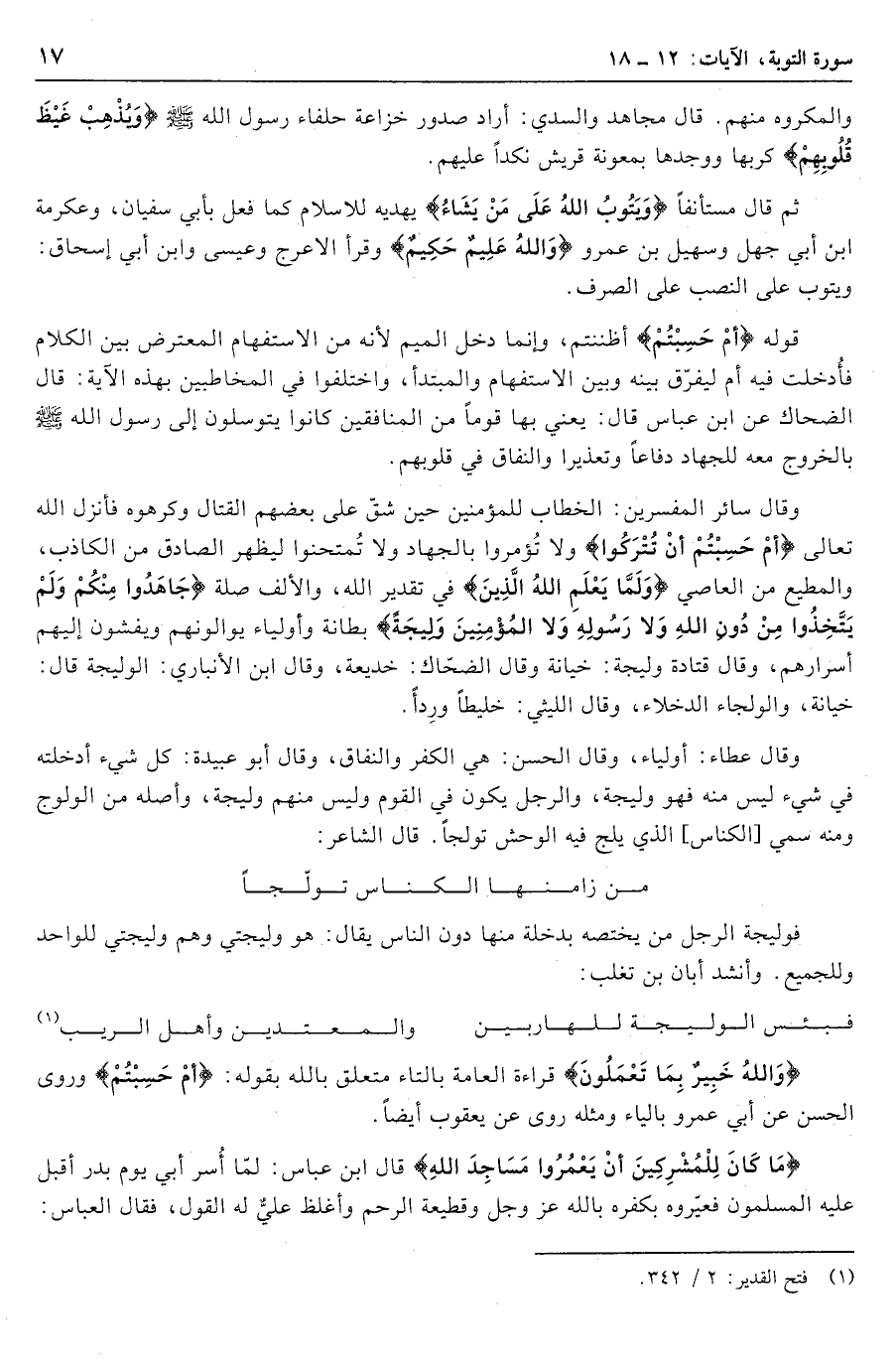 وقال سائر المفسرين: الخطاب للمؤمنين حين شقّ على بعضهم القتال وكرهوه فأنزل الله تعالى أَمْ حَسِبْتُمْ أَنْ تُتْرَكُوا ولا تؤمروا بالجهاد ولا تمتحنوا ليظهر الصادق من الكاذب، والمطيع من العاصي وَلَمَّا يَعْلَمِ اللَّهُ الَّذِينَ في تقدير الله، والألف صلة جاهَدُوا مِنْكُمْ وَلَمْ يَتَّخِذُوا مِنْ دُونِ اللَّهِ وَلا رَسُولِهِ وَلَا الْمُؤْمِنِينَ وَلِيجَةً بطانة وأولياء يوالونهم ويفشون إليهم أسرارهم، وقال قتادة وَلِيجَةً: خيانة وقال الضحّاك: خديعة، وقال ابن الأنباري: الوليجة قال: