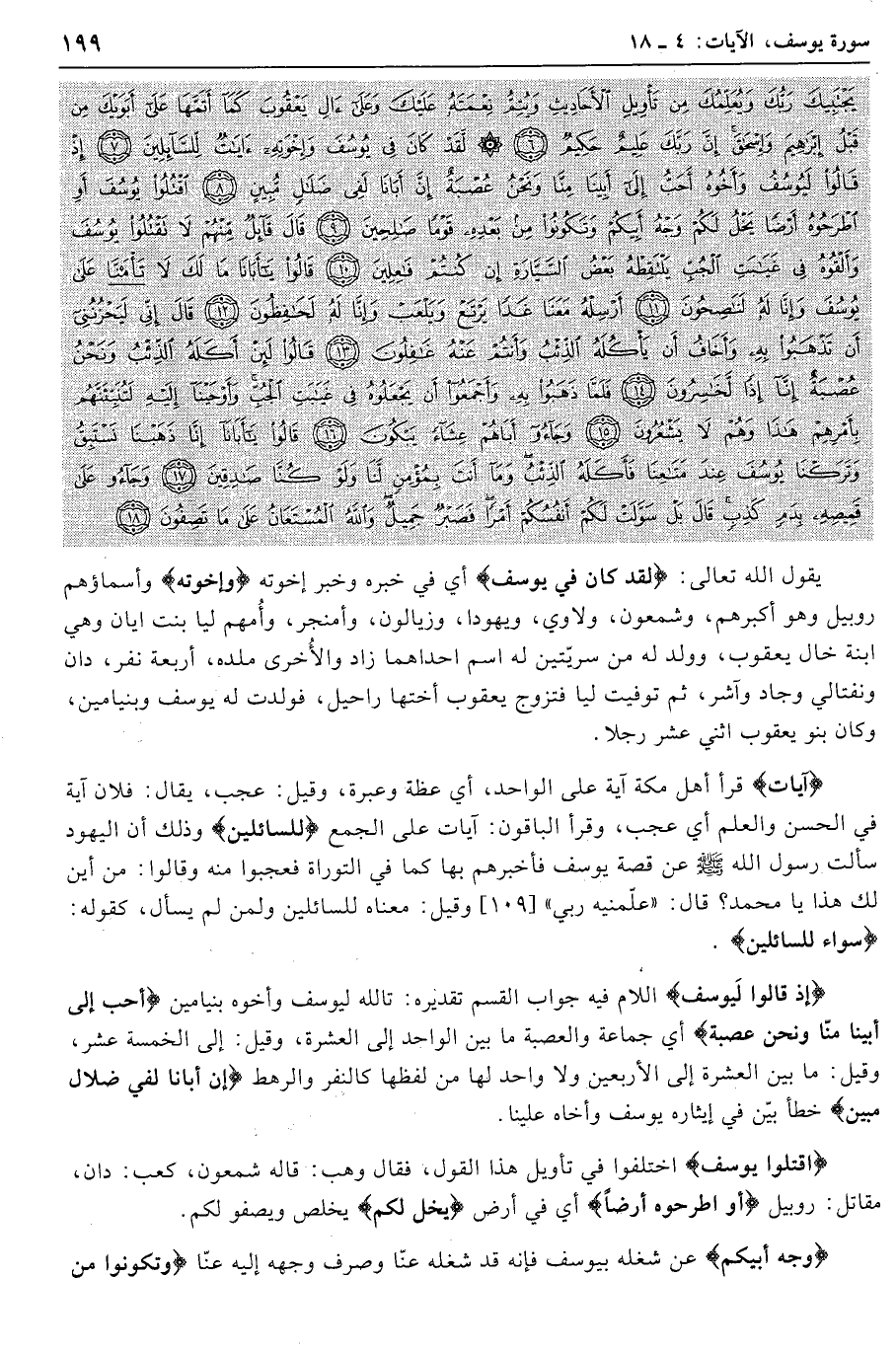 يقول الله تعالى: لَقَدْ كانَ فِي يُوسُفَ أي في خبره وخبر إخوته وَإِخْوَتِهِ وأسماؤهم روبيل وهو أكبرهم، وشمعون، ولاوي، ويهودا، وزيالون، وأمنجر، وأمهم ليا بنت أيان وهي ابنة خال يعقوب، وولد له من سريّتين له اسم إحداهما زاد والأخرى ملده، أربعة نفر، دان ونفتالي وجاد وآشر، ثم توفيت ليا فتزوج يعقوب أختها راحيل، فولدت له يوسف وبنيامين، وكان بنو يعقوب اثني عشر رجلا.