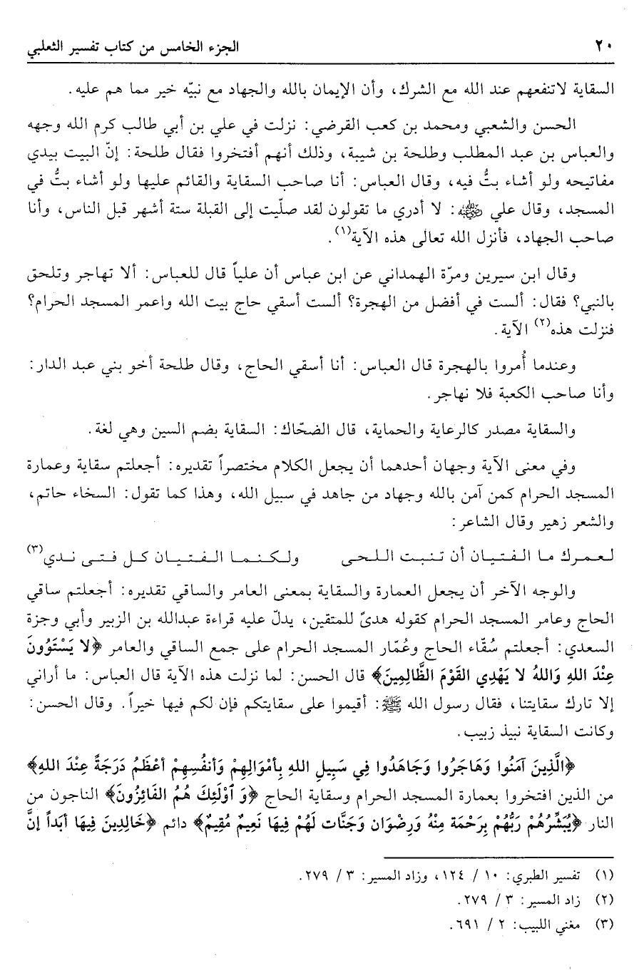 وفي معنى الآية وجهان أحدهما أن يجعل الكلام مختصرا تقديره: أجعلتم سقاية وعمارة المسجد الحرام كمن آمن بالله وجهاد من جاهد في سبيل الله، وهذا كما تقول: السخاء حاتم، والشعر زهير وقال الشاعر: