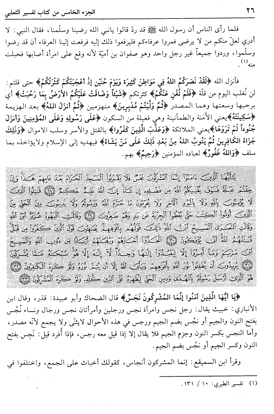 يا أَيُّهَا الَّذِينَ آمَنُوا إِنَّمَا الْمُشْرِكُونَ نَجَسٌ فَلا يَقْرَبُوا الْمَسْجِدَ الْحَرامَ بَعْدَ عامِهِمْ هذا وَإِنْ خِفْتُمْ عَيْلَةً فَسَوْفَ يُغْنِيكُمُ اللَّهُ مِنْ فَضْلِهِ إِنْ شاءَ إِنَّ اللَّهَ عَلِيمٌ حَكِيمٌ (28) قاتِلُوا الَّذِينَ لا يُؤْمِنُونَ بِاللَّهِ وَلا بِالْيَوْمِ الْآخِرِ وَلا يُحَرِّمُونَ ما حَرَّمَ اللَّهُ وَرَسُولُهُ وَلا يَدِينُونَ دِينَ الْحَقِّ مِنَ الَّذِينَ أُوتُوا الْكِتابَ حَتَّى يُعْطُوا الْجِزْيَةَ عَنْ يَدٍ وَهُمْ صاغِرُونَ (29) وَقالَتِ الْيَهُودُ عُزَيْرٌ ابْنُ اللَّهِ وَقالَتِ النَّصارى الْمَسِيحُ ابْنُ اللَّهِ ذلِكَ قَوْلُهُمْ بِأَفْواهِهِمْ يُضاهِؤُنَ قَوْلَ الَّذِينَ كَفَرُوا مِنْ قَبْلُ قاتَلَهُمُ اللَّهُ أَنَّى يُؤْفَكُونَ (30) اتَّخَذُوا أَحْبارَهُمْ وَرُهْبانَهُمْ أَرْباباً مِنْ دُونِ اللَّهِ وَالْمَسِيحَ ابْنَ مَرْيَمَ وَما أُمِرُوا إِلاَّ لِيَعْبُدُوا إِلهاً واحِداً لا إِلهَ إِلاَّ هُوَ سُبْحانَهُ عَمَّا يُشْرِكُونَ (31) يُرِيدُونَ أَنْ يُطْفِؤُا نُورَ اللَّهِ بِأَفْواهِهِمْ وَيَأْبَى اللَّهُ إِلاَّ أَنْ يُتِمَّ نُورَهُ وَلَوْ كَرِهَ الْكافِرُونَ (32)