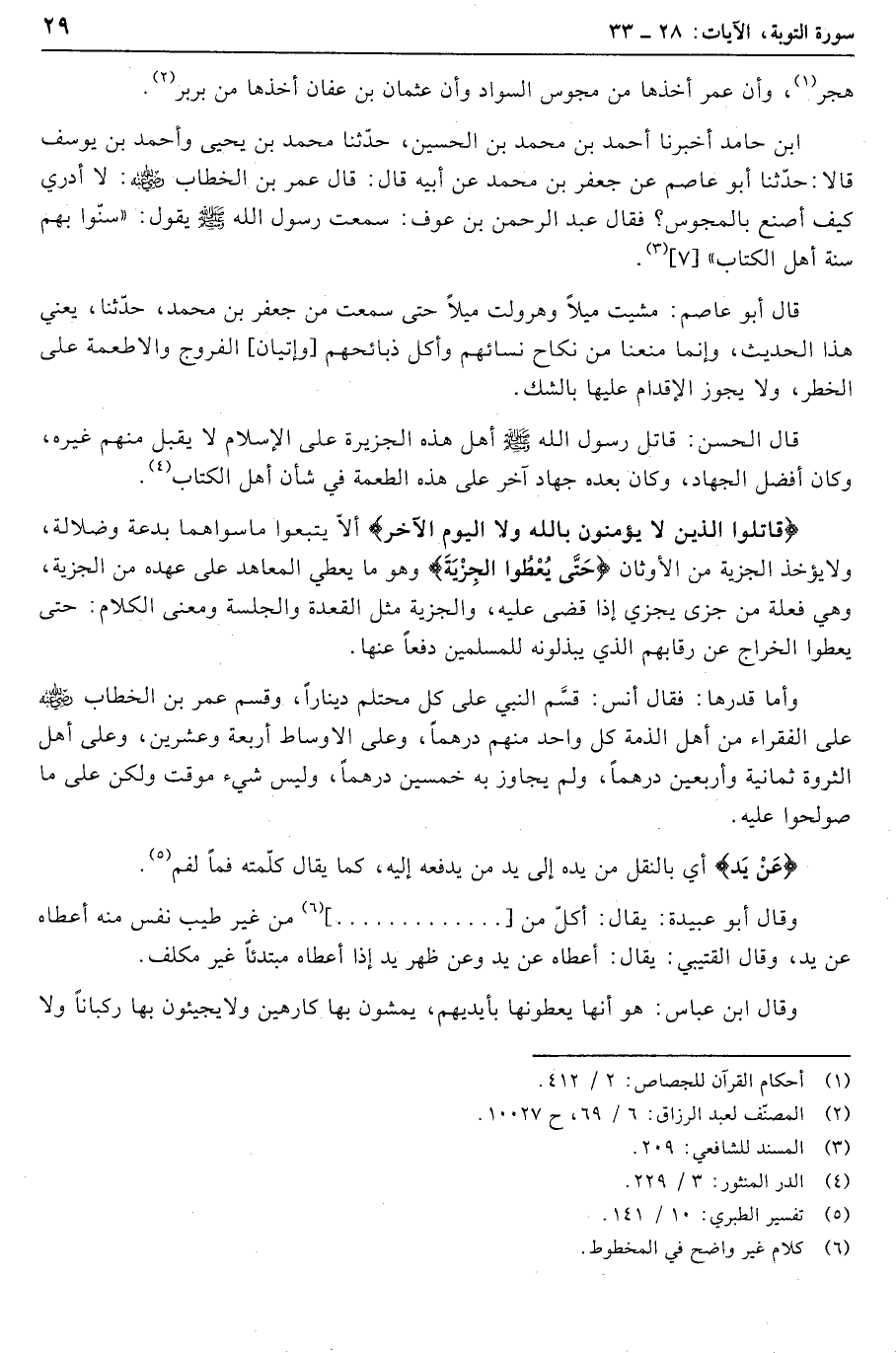 قاتِلُوا الَّذِينَ لا يُؤْمِنُونَ بِاللَّهِ وَلا بِالْيَوْمِ الْآخِرِ ألّا يتبعوا ما سواهما بدعة وضلالة، ولا يؤخذ الجزية من الأوثان حَتَّى يُعْطُوا الْجِزْيَةَ وهو ما يعطي المعاهد على عهده من الجزية، وهي فعلة من جزى يجزي إذا قضى عليه، والجزية مثل القعدة والجلسة ومعنى الكلام: حتى يعطوا الخراج عن رقابهم الذي يبذلونه للمسلمين دفعا عنها.
