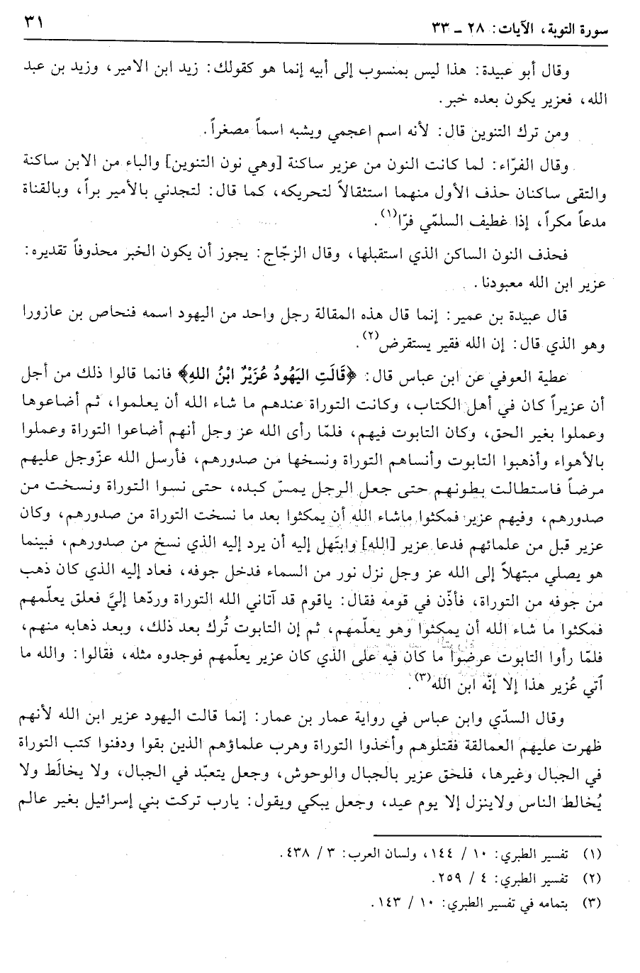 وقال أبو عبيدة: هذا ليس بمنسوب إلى أبيه إنما هو كقولك: زيد ابن الأمير، وزيد بن عبد الله، فعزير يكون بعده خبر.